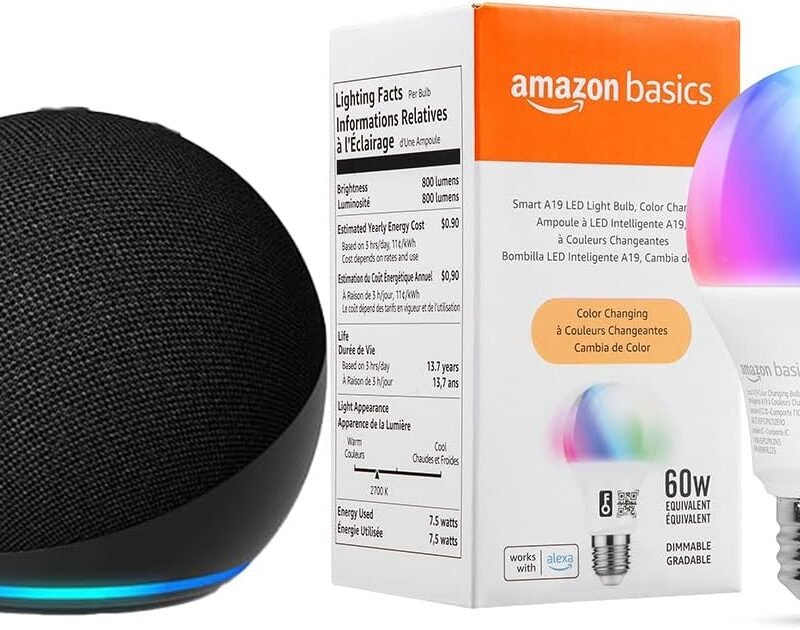 This bundle includes an Echo Dot in Charcoal and an Amazon Basics Smart Color Bulb.Amazon Basics smart light bulbs offer voice control through Alexa and app control via the Alexa app. You can set automatic schedules, such as turning lights on at sunset and off at sunrise. These bulbs feature…