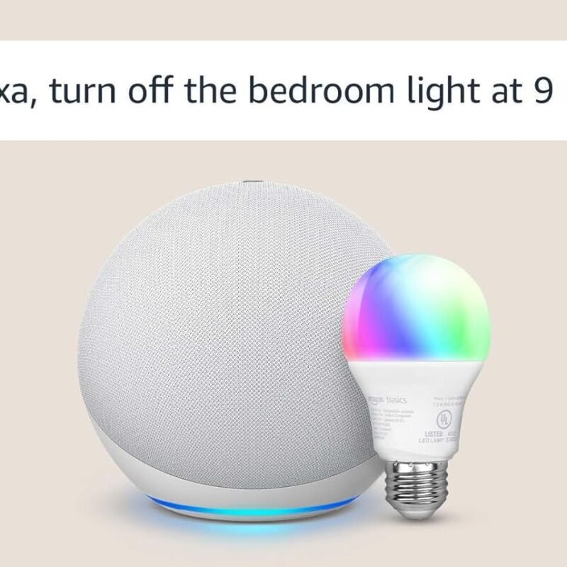 This bundle includes an Echo (4th Gen) in Glacier White and an Amazon Basics Smart Color Bulb.Amazon Basics smart light bulbs offer voice control through Alexa and app control via the Alexa app. You can set automatic schedules, such as turning lights on at sunset and off at sunrise. These…