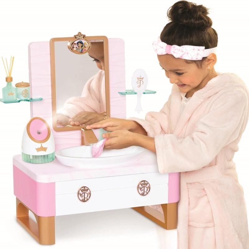 Relax, Refresh, & Renew with the Disney Princess Style Collection Deluxe Day Spa vanity. Features a real working sink and a pretend facial steamer along with the latest contemporary skincare essentials. With the push of a button, turn on the real working sink with running water. Wash & “steam” your…