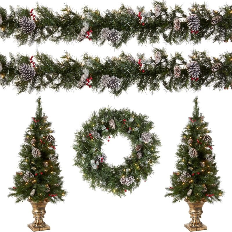 These Artificial Christmas assortments include a set of entrance trees, a wreath and a garland, all pre-strung lights. Welcome Christmas and the winter season with these bright and cheery holiday decorations. These decor items are designed with a fire-resistant and non-allergenic material. The entrance tree is a great accent piece…