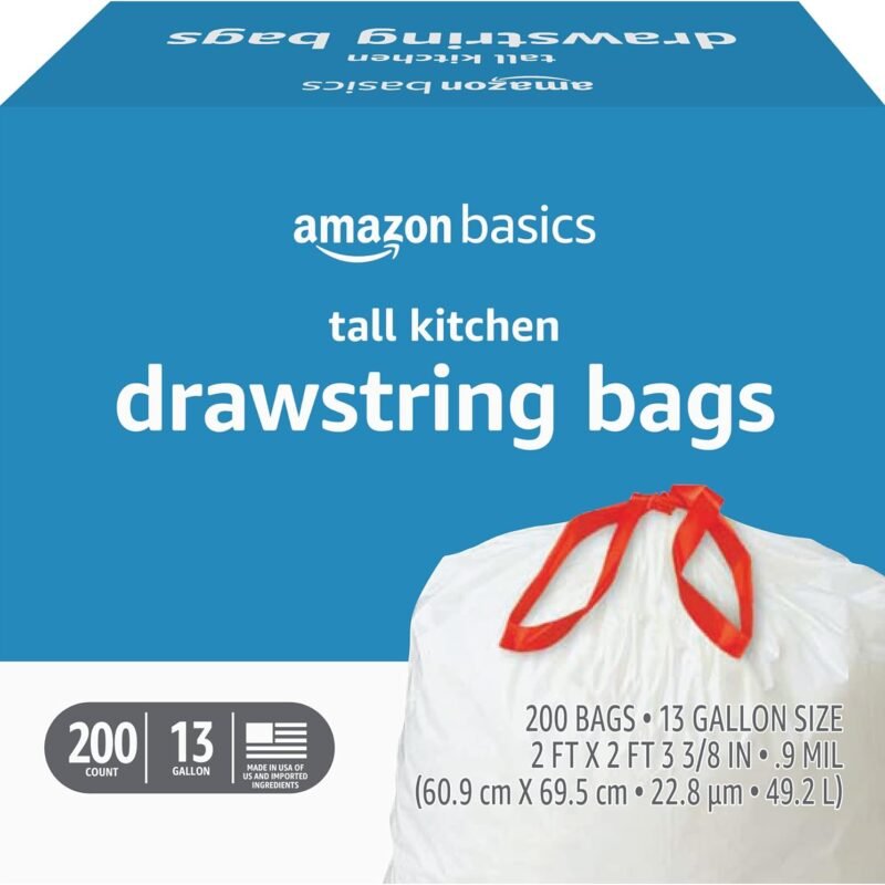 Amazon Basics Tall Kitchen Drawstring Trash Bags, 13 Gallon, Unscented, 200 Count (Previously Solimo), Each trash bag has a 13-gallon capacity. White trash bag with red drawstring closure for easy tying and carrying Includes 200 tall kitchen garbage bagsIndividual bag dimensions: 24inches wide x 27 3/8 inches tall with 0.9…