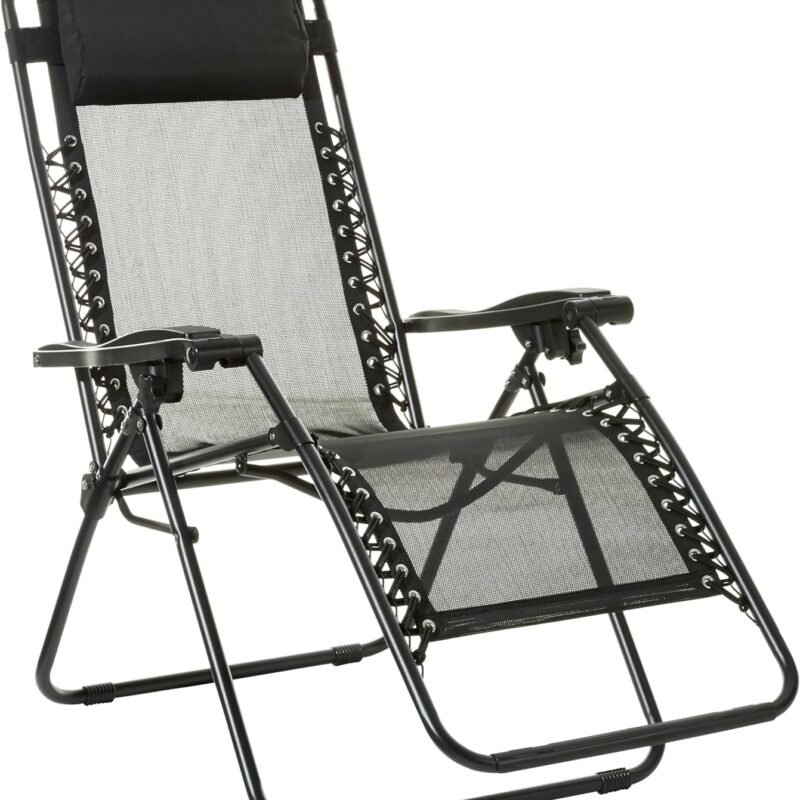 Amazon Basics Outdoor Textilene Adjustable Zero Gravity Folding Reclining Lounge Chair with Pillow, Black Adjustable zero-gravity outdoor chair in Black offers a weightless feel for optimal relaxationPadded headrest pillow provides extra comfortReclining mechanism for easily transitioning from sitting upright to leaning back with legs raised; contoured armrests provide added ergonomic…