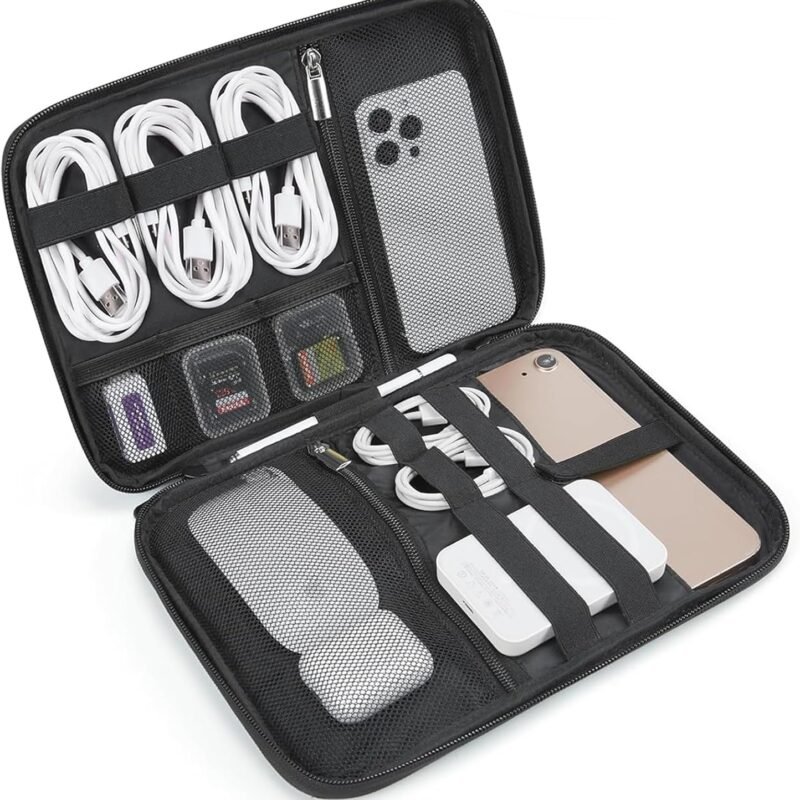 From the brand Electronics Organizer Holiday Gifts Makeup Bags Toiletry Bags Compression Packing Cubes Jewelry Bags Laptop Sleeve Carry on Luggage Backpacks Compact and space-saving size: 9.8″L x 6.7″W x 1.4″H, Weight: 0.24 lbCompatible Space: The electronics storage bag keeps all gadgets in one place, 5 elastic loops(S) for slender…