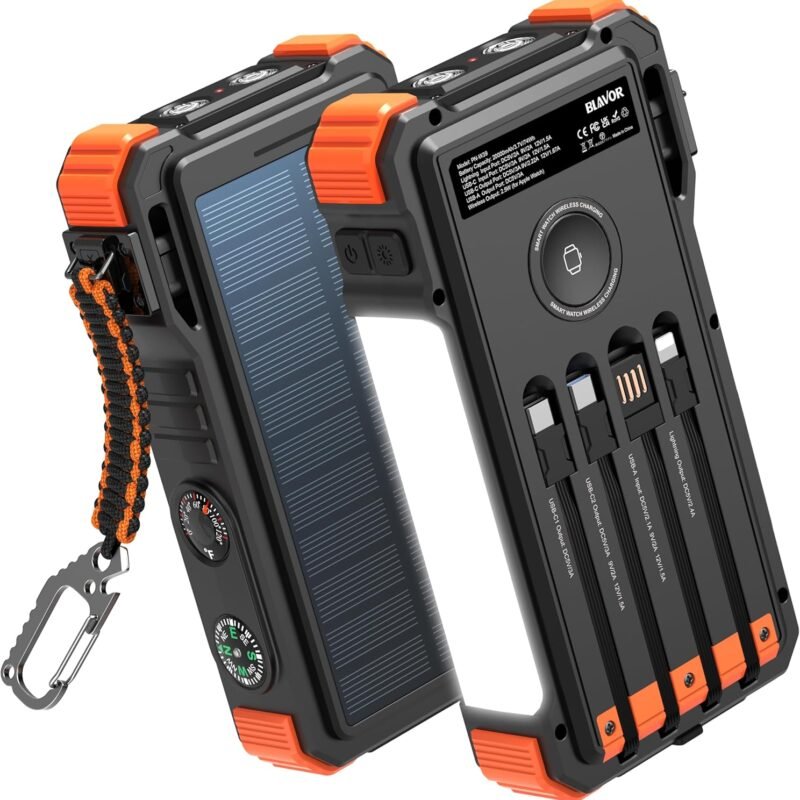 Product Description 1 Outdoor Essentials 2 2 Recharge Ways 1 Camping Light 2 Flashlight 3 Red Light Pointer 1 Carabiner 2 Compass 3 Thermometer 4 Bottle Opener 1 Wide Compitable 2 Safety Protection Simultaneously Charge 6 Devices: The BLAVOR solar charger is your ultimate charging solution! With its 4 built-in…