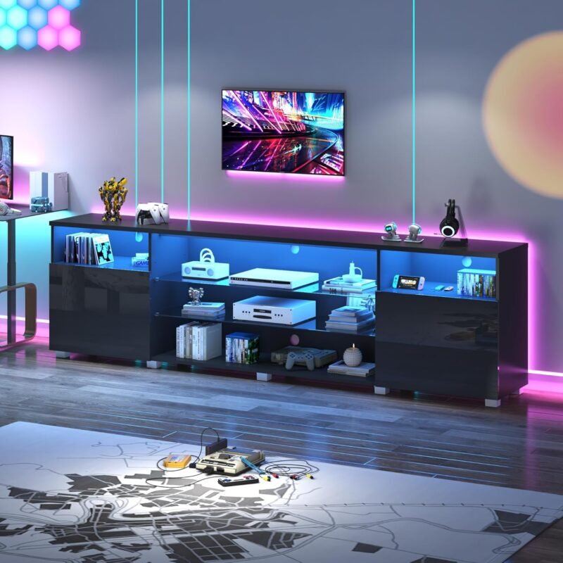 Product Description 【High LED TV Stand】High hardness particleboard and tempered glass, using a smooth paint process, while ensuring firmness and permeability, it is very beautiful and practical.【 Adjustable LED Remote System】Equipped with remote control, features 20 colors of RGB LED lights and 8 flash effects. This LED lights system is…