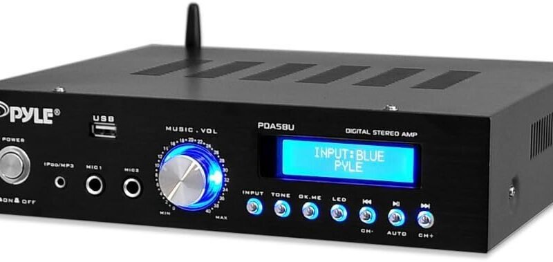 PyleHome Model : PDA5BU Bluetooth Stereo Home Amplifier Receiver Bluetooth Stereo Amplifier, Compact Home Audio Receiver with AM/FM Radio, MP3/USB/AUX (200 Watt) Features: Compact Tabletop Stereo Amplifier Receiver Built-in Bluetooth for Wireless Music Streaming AM/FM Radio with LCD Digital Display Aux (3.5mm) Input Jack Ability to Connect External Devices USB…