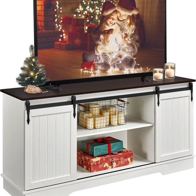 Product Description Living Room Furniture Farmhouse TV Stand for 65” TV Storage Space Product Details Particle Board Crafted out of selected particle board, body-harmless and suitable for long-time usage. Barn Door 2 slideable barn doors boast great flexibility, allowing you to easily access to all of the cabinets. Adjustable Compartments…