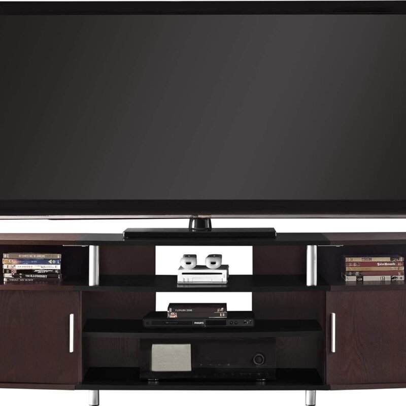Elevate your entertainment space with the great-looking contemporary Ameriwood Home Carson TV Stand. The clean lines of this MDF and laminated particleboard TV stand with a two-tone cherry/black finish and silver metal accents makes this piece stand out in any room. Accommodating up to a 70-inch flat screen TV, this…