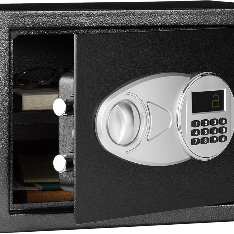 An Amazon Brand. 0.5-cubic-feet security safe with electronic lock and 3 operation indicator lights; powered by (4) AA batteries (not included)Includes 2 emergency override keys to protect against forgotten passcodes or dead batteries; keep keys in a well-hidden, secure locationStrong steel construction with carpeted floor to protect against scratches and…