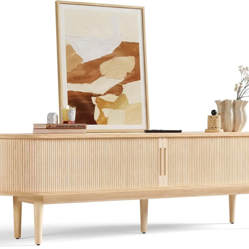 LINSY HOME TV Stand for 75″ TV, Mid-Century Modern 70″ Entertainment Center with Sliding Tambour Door and Storage Cabinet, Cruved TV Media Console Table for Living Room, Bedroom, Oak No FabricFluted Tambour Sliding Door – With its distinctive curved silhouette and slatted tambour sliding door design in a mid-century color,…