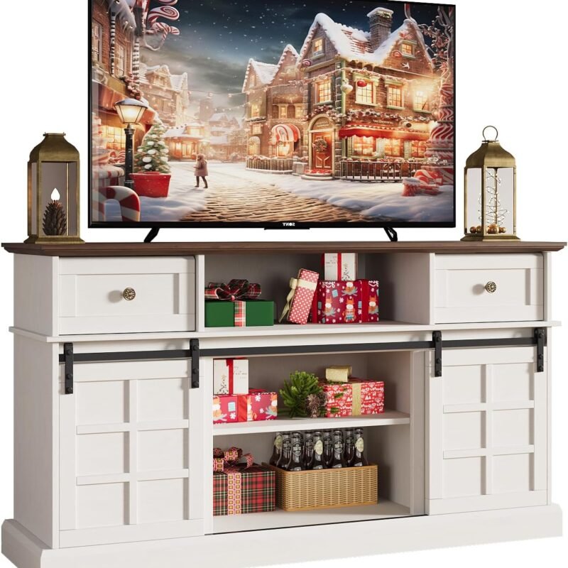 Product Description LINSY HOME Farmhouse TV Stand with Storage and Living Room Set The video showcases the product in use.The video guides you through product setup.The video compares multiple products.The video shows the product being unpacked. LINSY HOME Functional Farmhouse TV Stand Premium Product Details Height Adjustable Panel Cable Cutout…