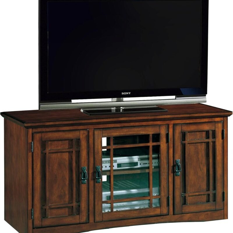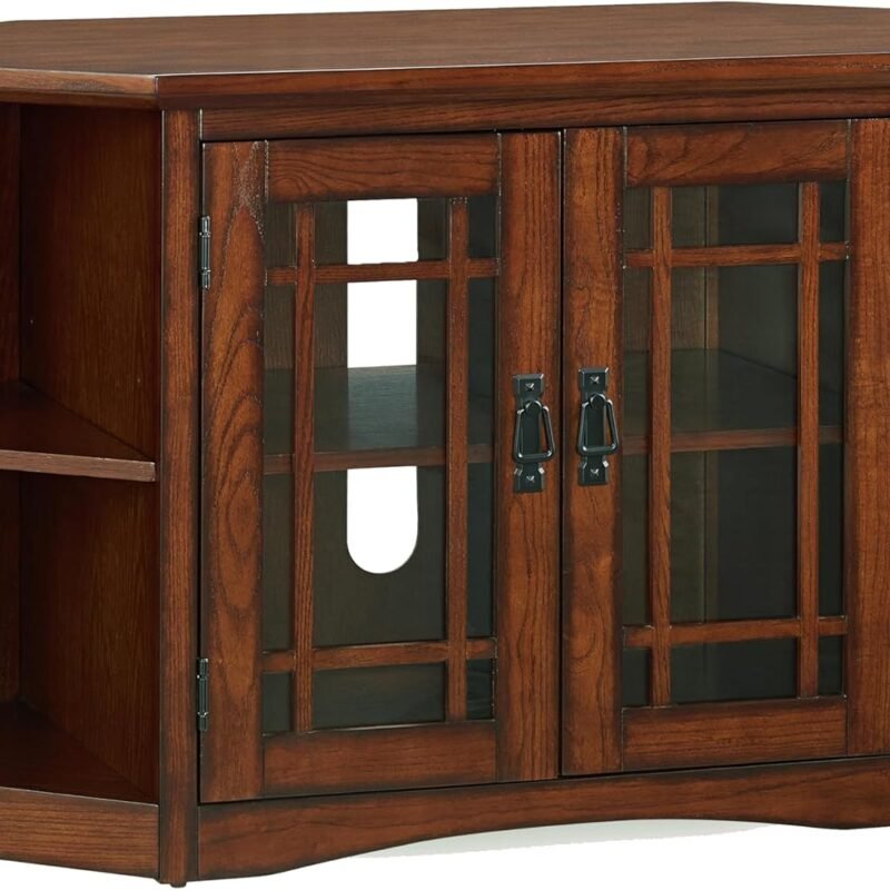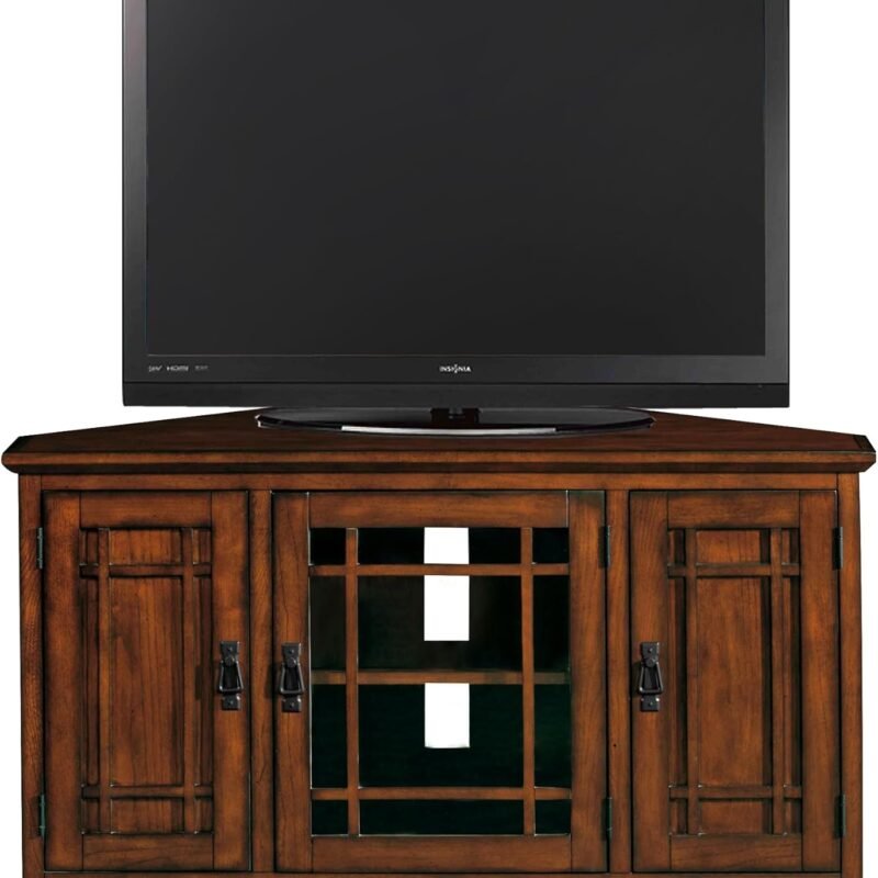 The Leick Home Mission Oak Corner TV Stand incorporates the best elements of mission design, including storage shelves, blackened hardware, and of course, a rich oak finish. This TV console has a micro-beveled top edge and clear glass doors. This living room entertainment center holds up to a 50” TV….
