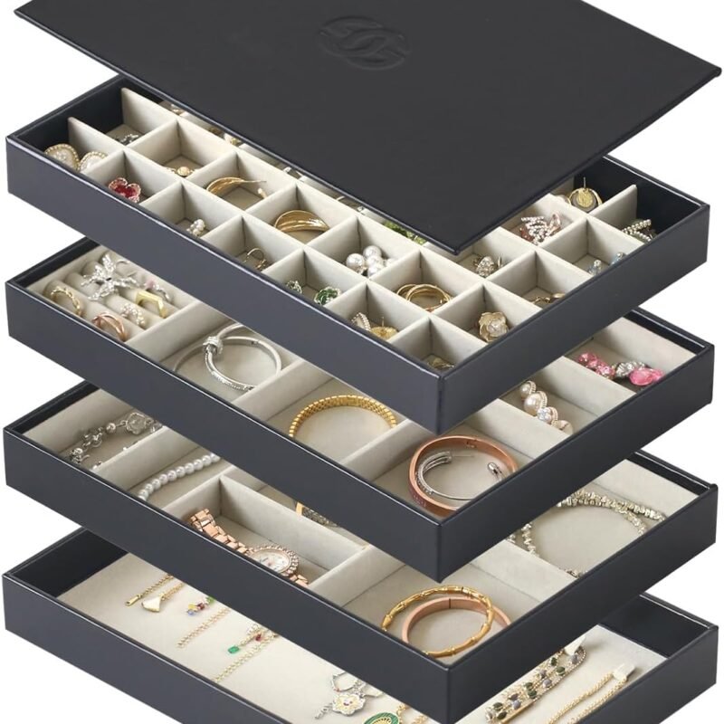 Product Description 1 Jewelry Storage Tray 2 35 Grids 3 Rings 4 Bracelet 5 Necklace 5 in 1 Large Capacity Jewelry Tray 1. 5 in 1 Jewelry Organizer Tray with Lid 2. PU Leather Exclusive Protection Jewelry of preventing oxidation 3. Premium Grey Stackable with 4 Layer 4. Large Capacity…