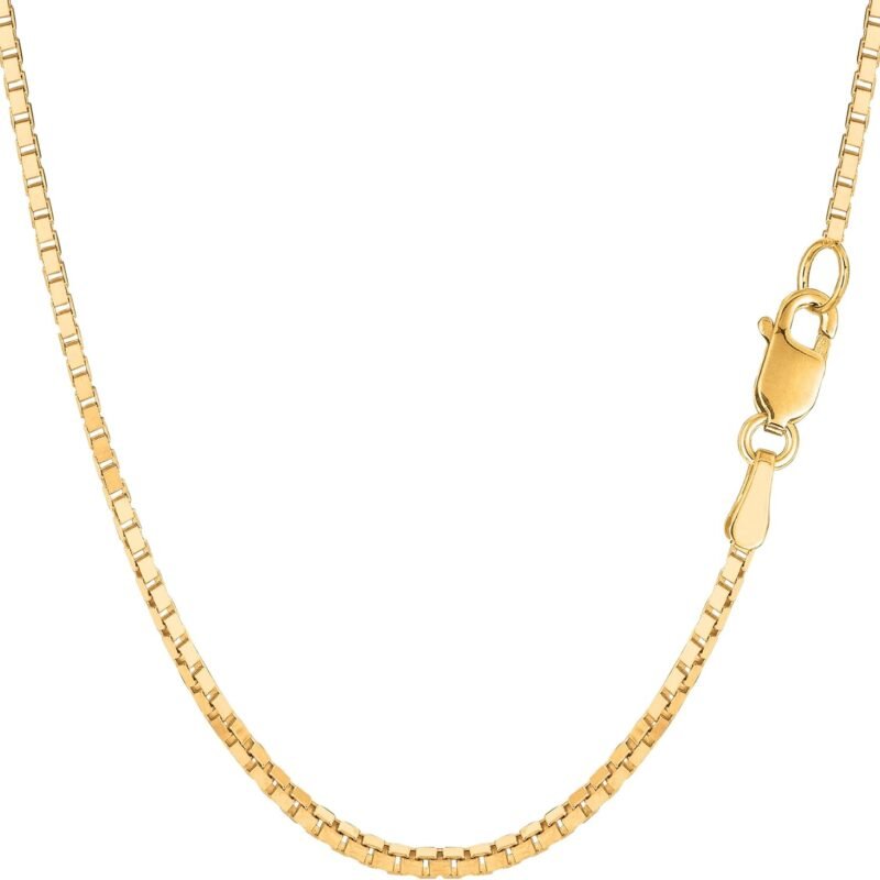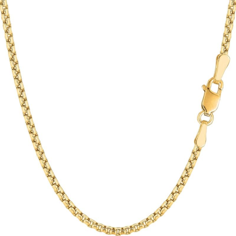 Product Description 14k Yellow Gold Round Box Chain Necklace, 2.1mm This 14k yellow gold box chain offers luminously polished facets and a silky smooth look. At a 2.4 mm thickness this chain is available in an 16″ 18″ 20″ and 24″ length. Perfect for pendants and can also be worn…