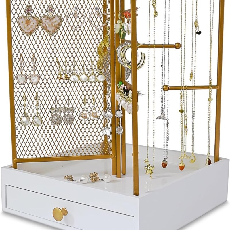 white jewellery stand 💝【Convenient Display Stand for Jewelry】Easy access to earrings, necklaces, bracelets, and rings.💝【Space-Saving Earring and Necklace Organizer with Large Capacity】This 4-sided metal jewelry rack design keeps all your jewelry neatly organized, preventing loss and maximizing space.💝【Easy Assembly Jewelry Towers】Simply assemble the wooden drawers and two metal jewelry hangers…