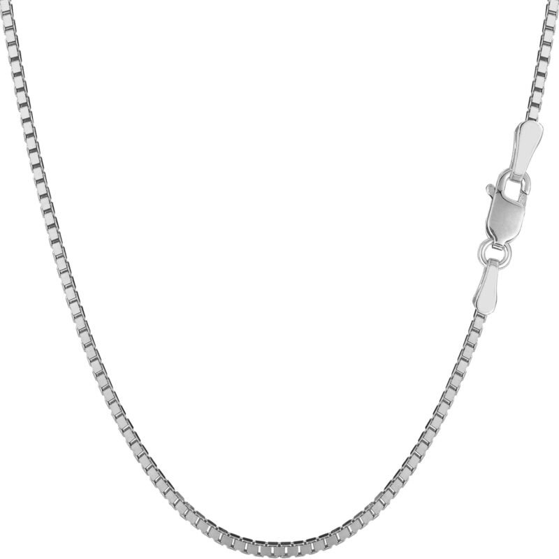 Product Description 14k White Solid Gold Mirror Box Chain Necklace, 1.4mm This 14K white gold box chain offers luminously polished facets and a silky smooth look. At a 1.4 mm thickness this chain is available in different lengths. Perfect for pendants and can also be worn alone. Includes a lobster…