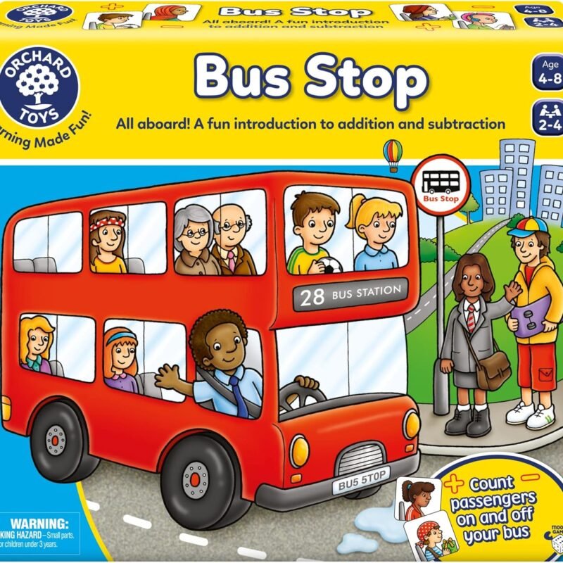 In Orchard Toys “Bus Stop” game is a simple addition and subtraction counting game where you race to the bus station, picking up and dropping off passengers as you go! Throw the dice to move your bus around the board, either landing on a plus or minus square. Players spin…