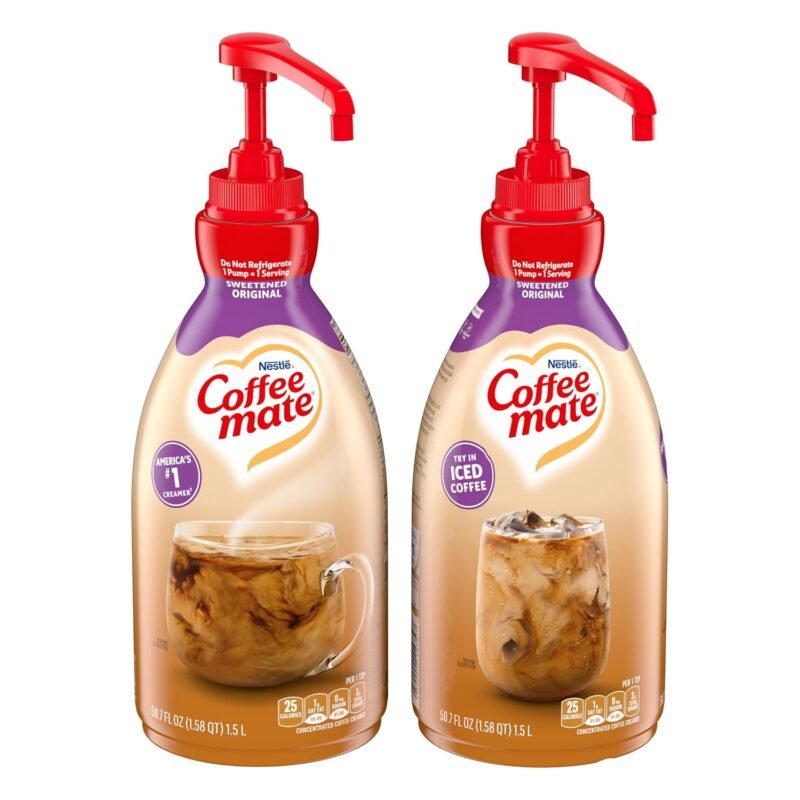 Nestle Coffee mate Liquid Concentrate Pump Bottle Sweetened Original flavor coffee creamer is a classic favorite with a deliciously rich, velvety smooth finish that will enhance your cup of coffee. Packaged in a 1.5L liquid concentrate pump bottle this format is the perfect solution that is easy to use and…
