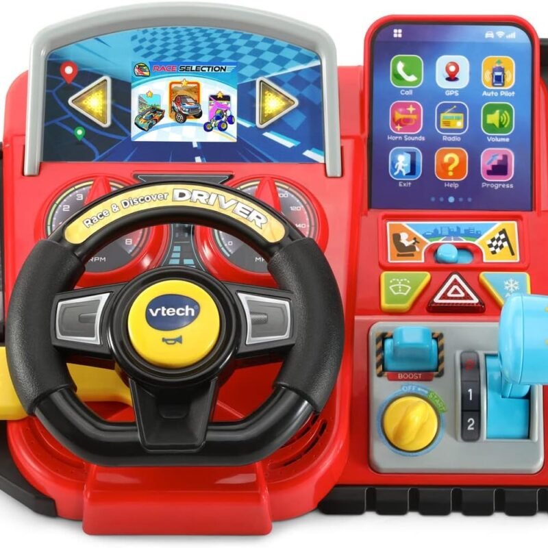 Preschoolers, start your engines and buckle up for excitement with the Race and Discover Driver! This driving toy for kids has a colorful game screen and features of a real car including a steering wheel, gear shift, turn signals, hazard lights, wipers and horn. Use the interactive dashboard buttons to…