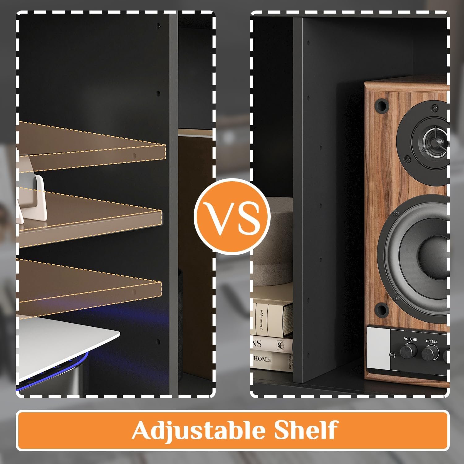 [Large Storage Space] – This black TV stand for TVs up to 75 inches comes with ample storage space, it offers total 18 storage compartments, and the open shelf on the TV console table is adjustable with pre-drilled holes, you can easily adjust heights or remove the shelf to store larger items like fireplace. The doors on the top shelf are lift-up to open.