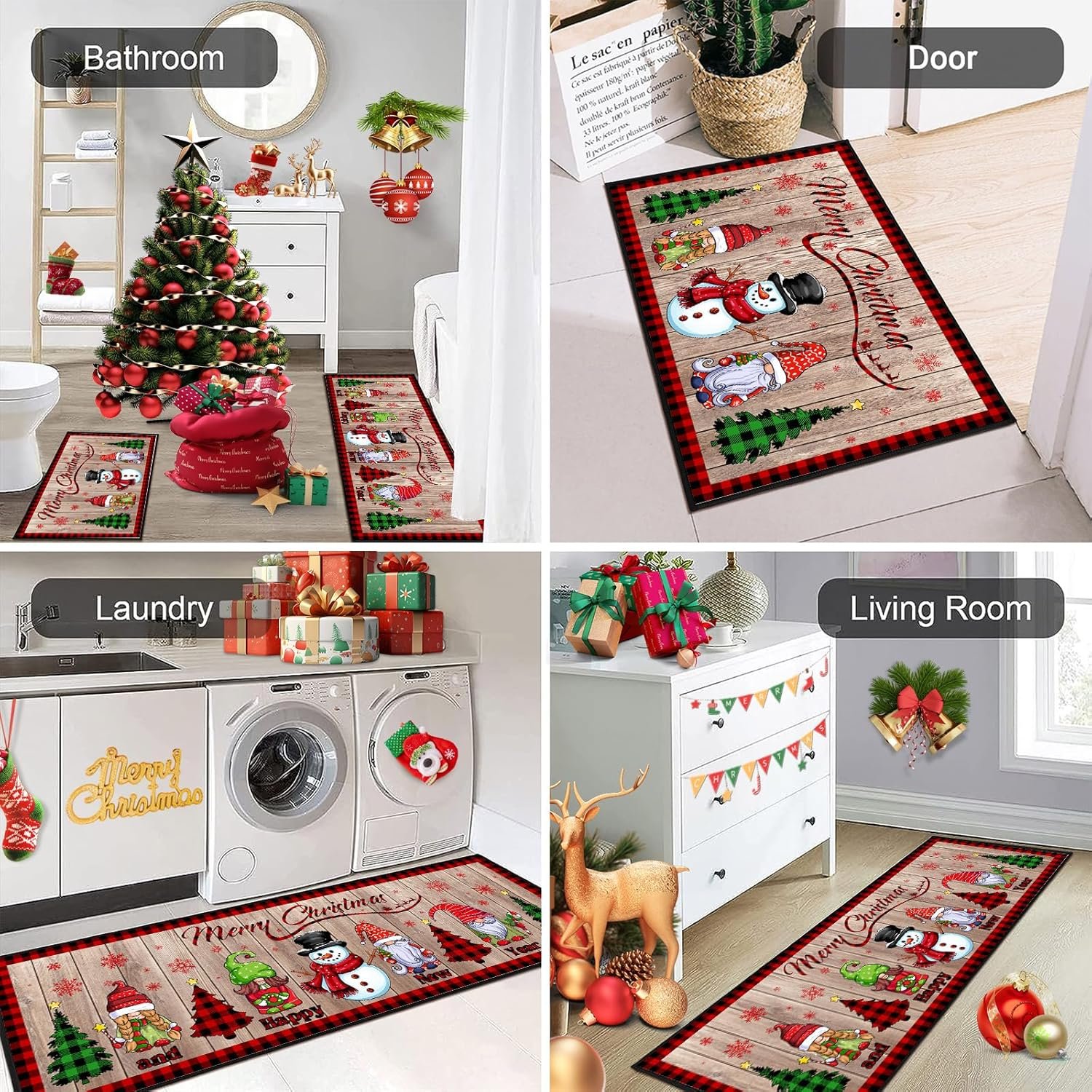 2 Pcs Christmas Kitchen Rugs and Mats, Merry Christmas and Happy New Year Kitchen Decor Non-Slip Floor Mat Sets, Gnome Snowman Washable Microfiber Kitchen Carpet 17×47+17×30 Inches