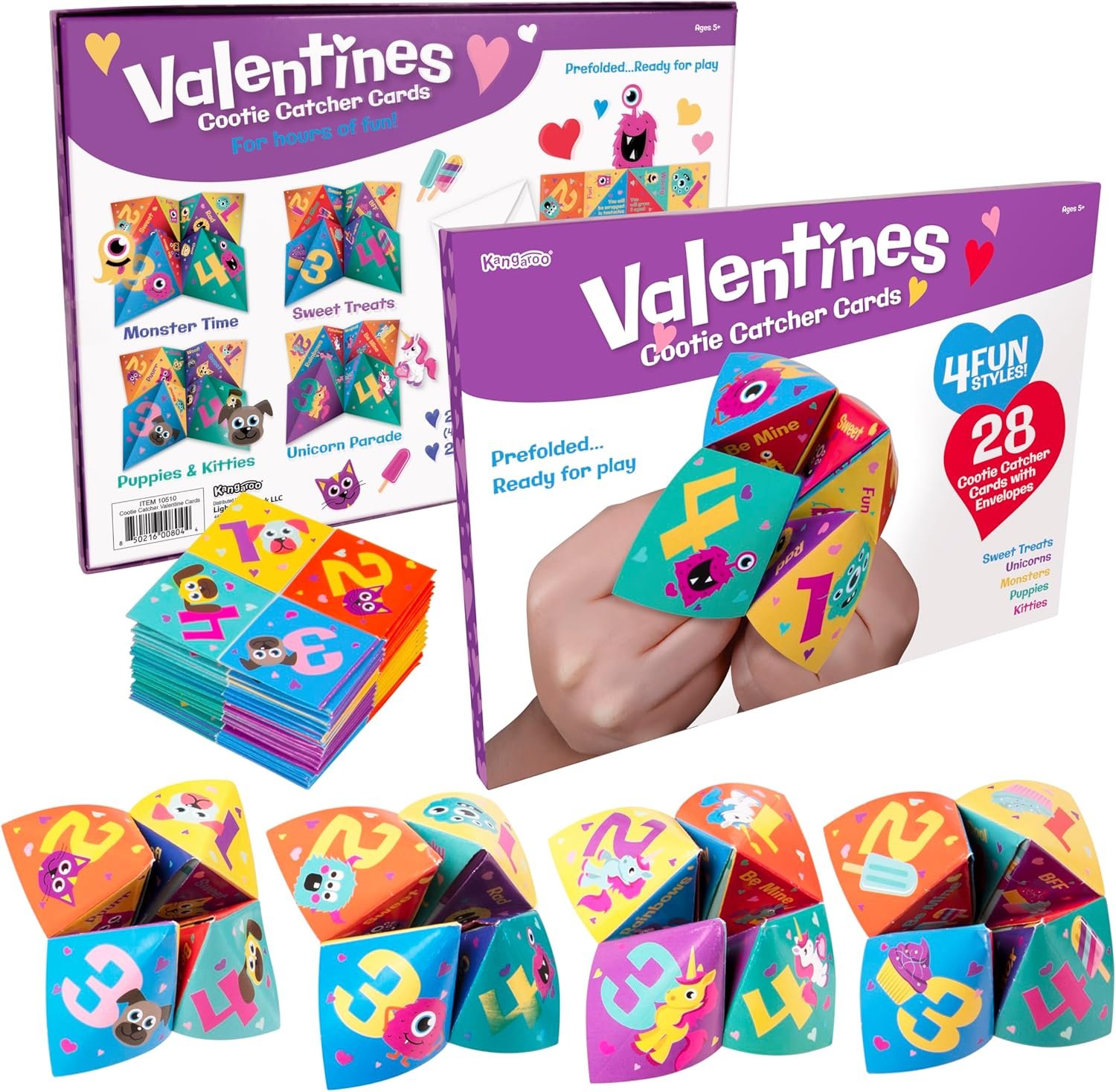 We are offering 28 cootie catcher pre folded valentines gifts for kids comes with 5 different designs including sweet treats, unicorns, monsters, puppies, & kitties, as well as 28 greeting card envelopes for valentines gift exchange gifts. These valentine gifts for kids are specially designed for kids to play with your friends & family at valentine’s events, & parties. Ideal for use as valentine greeting cards & as fun valentine day gifts for kids to have a memorable day. Age 3 & up recommended