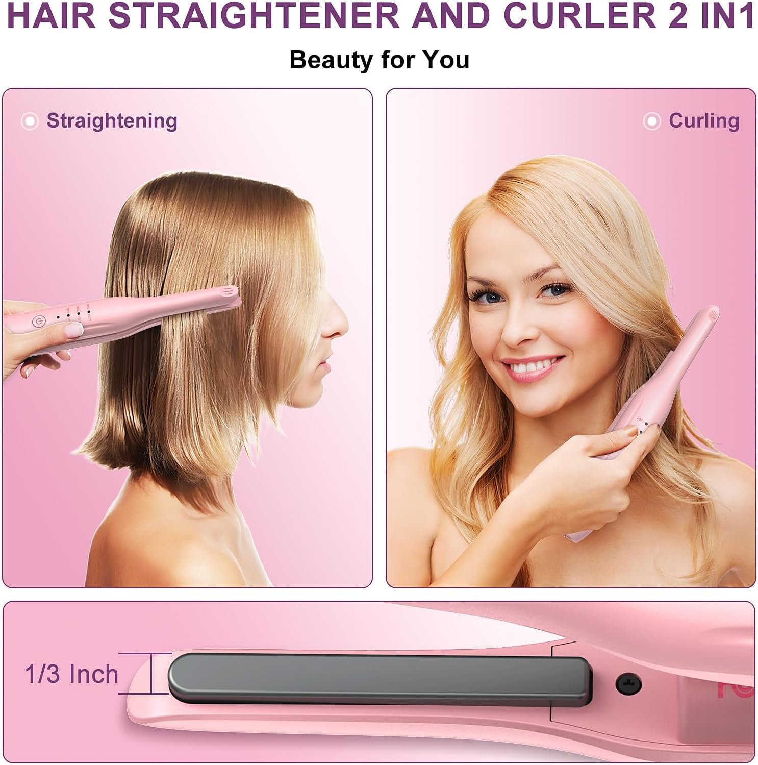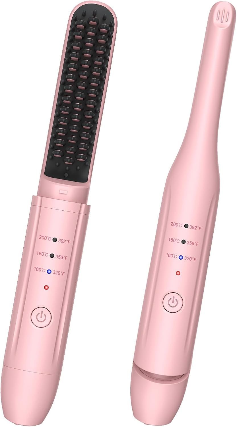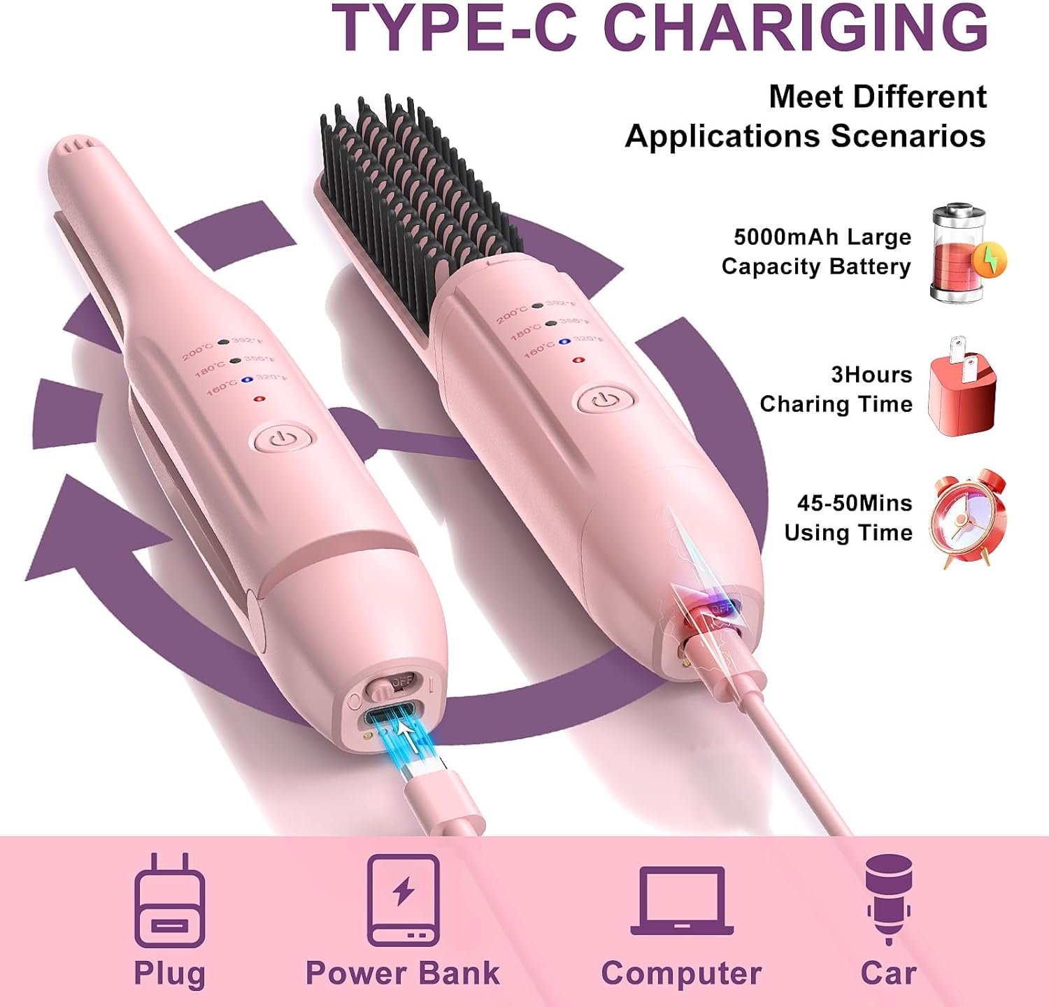 2Pcs Pink Cordless Portable Hair Straightener and Travel Hair Straightener Brush Set with Carrying Case, Hair Straightening Irons and Hot-Air Hair Brushes Set for Beauty and Personal Care