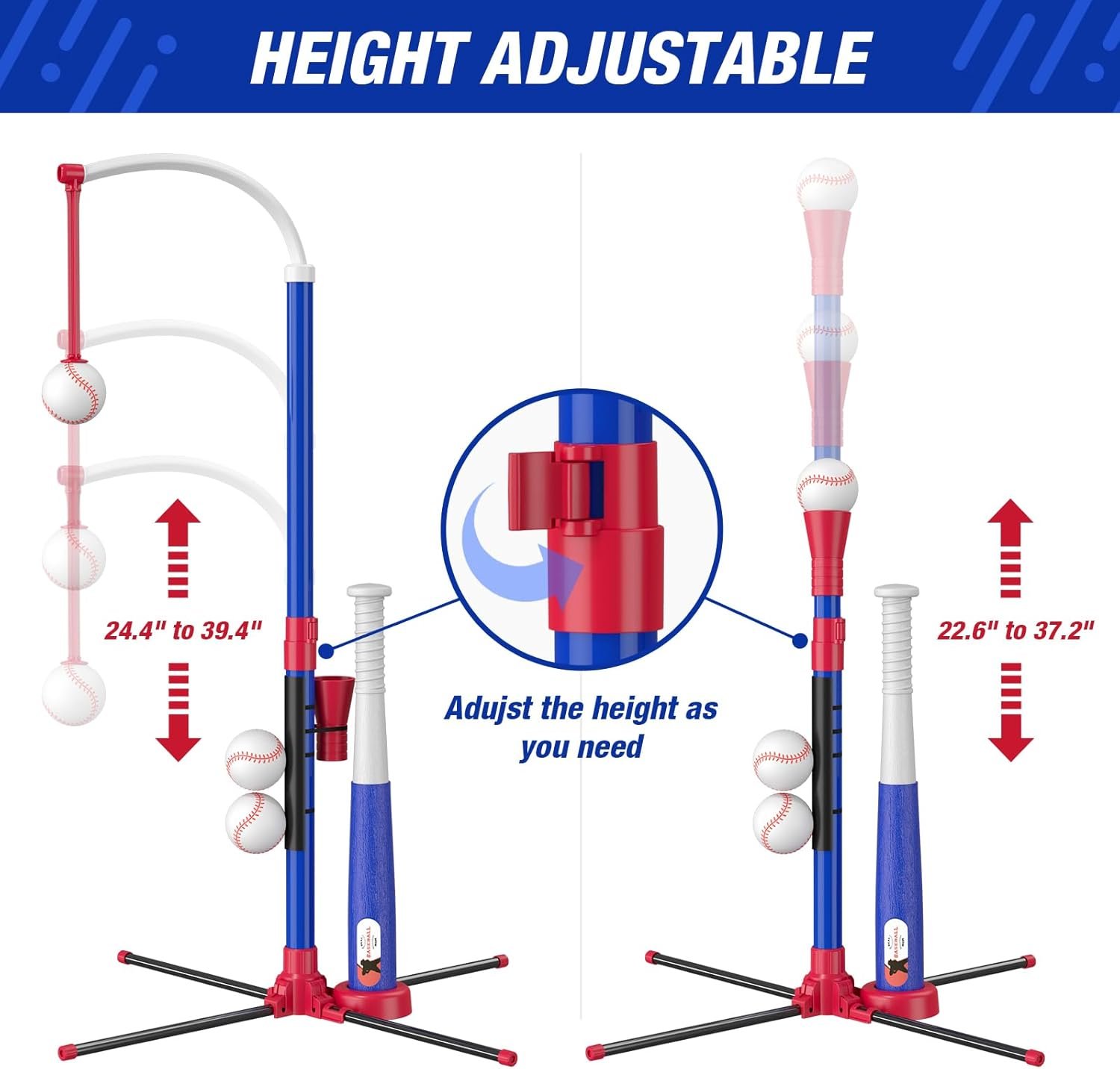 ADJUSTABLE HEIGHT – ①The hanging baseball tee adjusts from 24.4″ to 39.4″ in height. ②The fixed standing tee adjusts from 22.6″ to 37.2″ in height. Easy to twist and lock the height, you can adjust different heights for your child. Let the baseball toys grow with your child