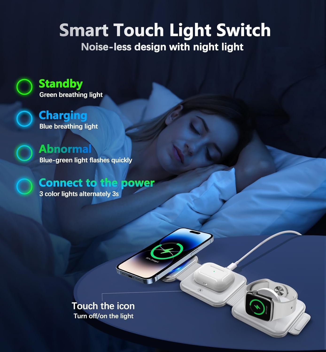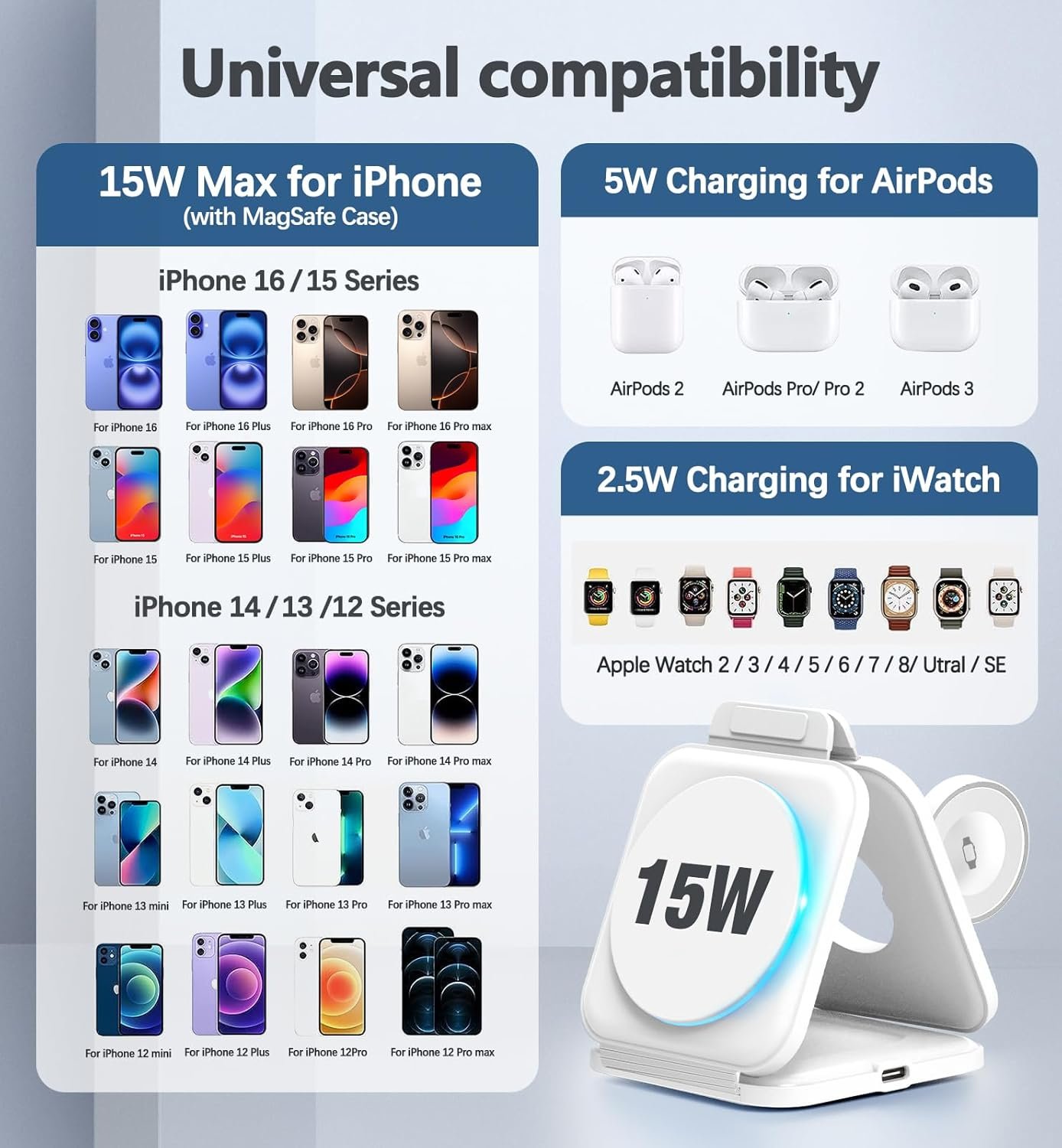 Essential Partner for Apple Series:With the 3-in-1 wireless Apple charging station, you can wirelessly charge Mag-Safe compatible iPhones, AirPods, and iWatch simultaneously, eliminating cable clutter and simplifying your daily charging routine.