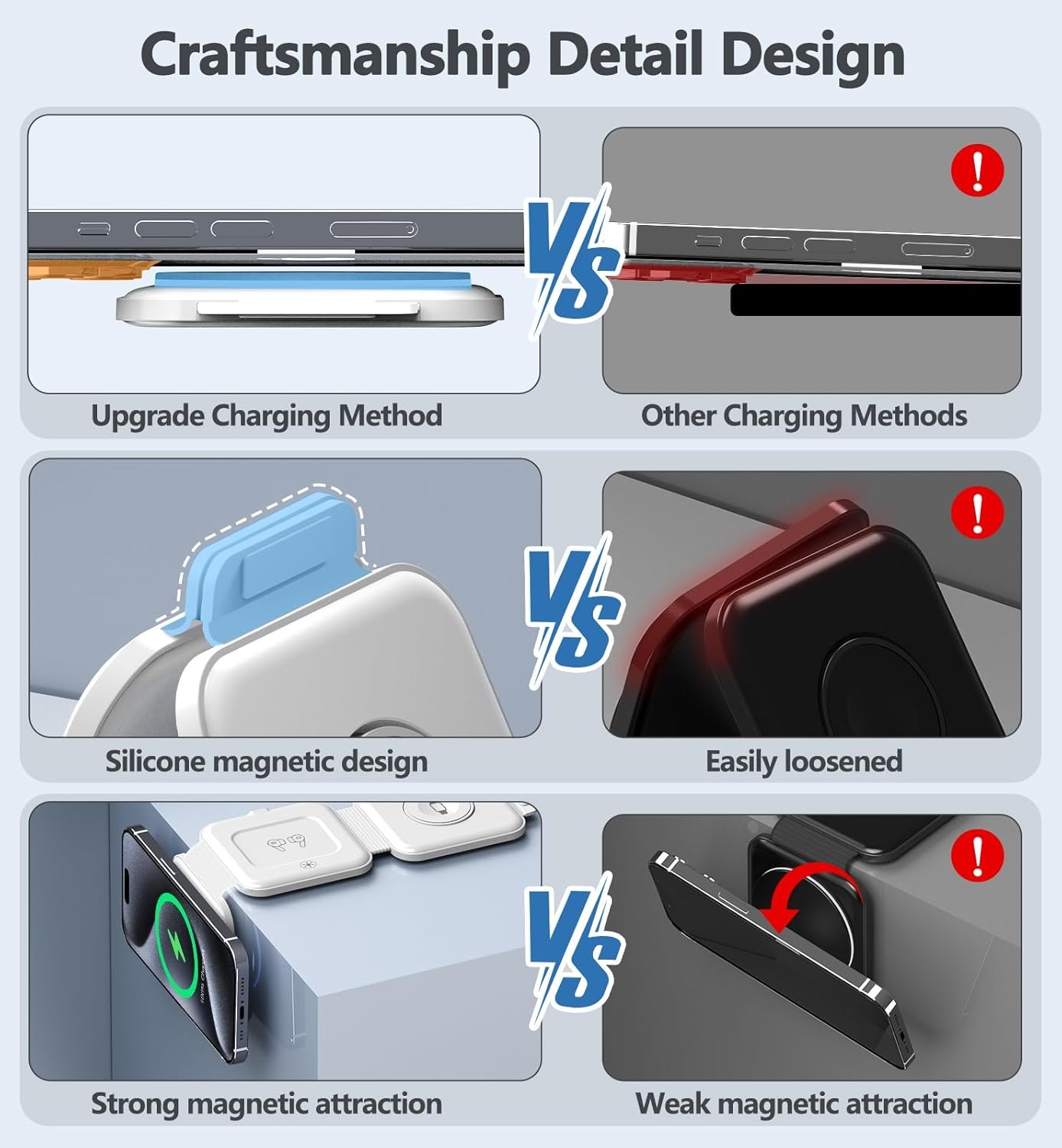 🚀【𝗠𝗮𝗴𝗻𝗲𝘁𝗶𝗰 𝗔𝗹𝗶𝗴𝗻𝗺𝗲𝗻𝘁 & 𝗦𝘁𝗿𝗼𝗻𝗴 𝗔𝗱𝘀𝗼𝗿𝗽𝘁𝗶𝗼𝗻】Three wireless chargers with strong magnetic design, and built-in high-quality magnets, accurately locate the best position for wireless charging, bringing you a fast and stable wireless charging experience. ✅Note: The iPhone Magnetic charger supports the iPhone 15/14/13/12 series and the latest iPhone devices. ✅It is recommended to use a magnetic phone case or wear a case ≤ 5MM.