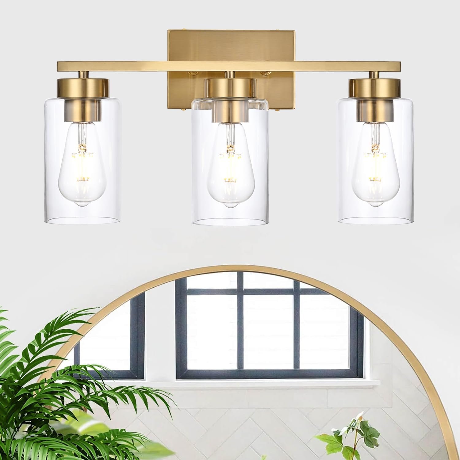 3-Light Bathroom Vanity Light, Modern Brushed Gold Wall Lights with Clear Glass Shades, Bathroom Wall Sconce Lamp for Mirror Living Room Bedroom Hallway
