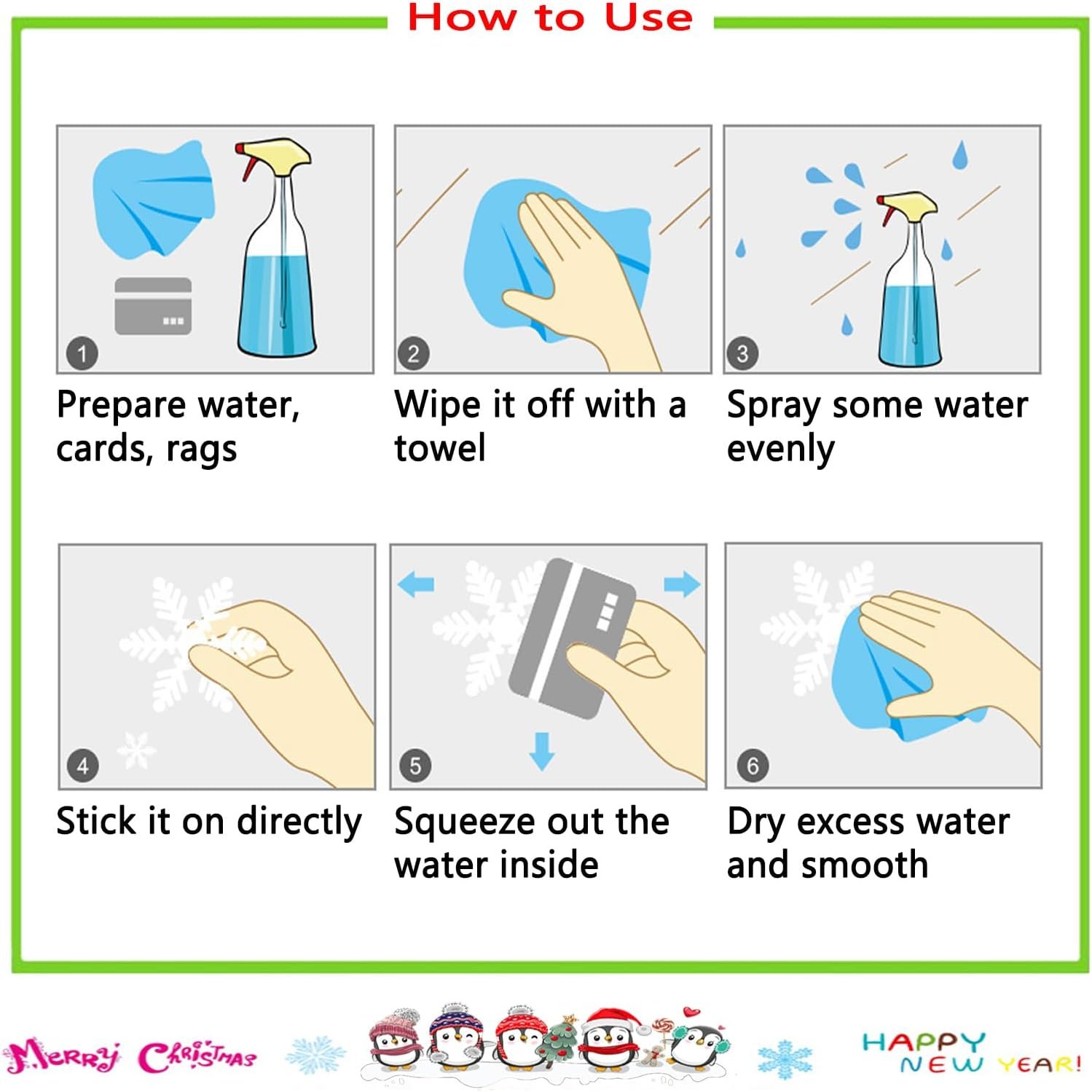 Easy to use xmas window clings: Holiday window clings for glass windows can be used without glue. spray the area to be posted with water before use, then apply christmas stickers for windows, finally dry and wipe it flat without leaving any marks.