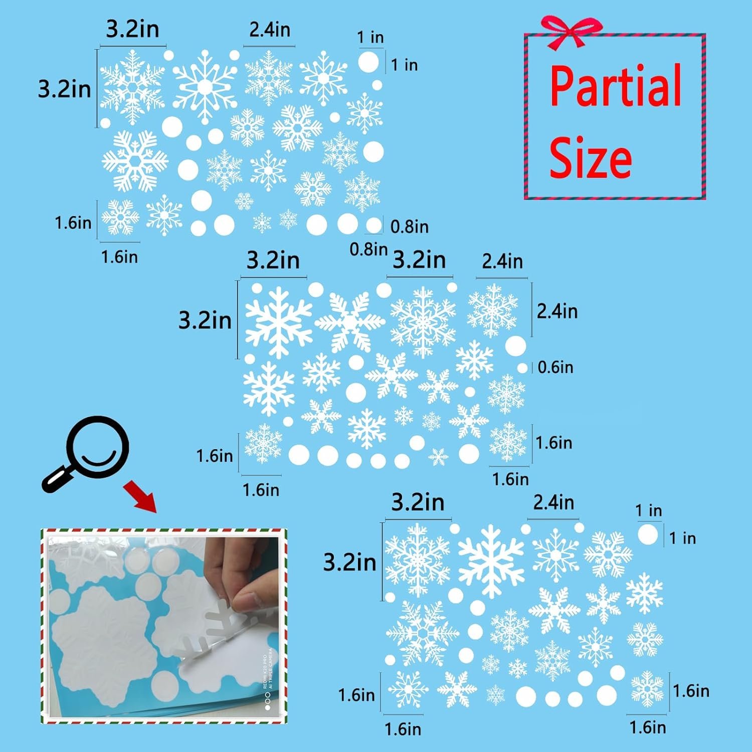 Plenty snowflake decorations: 321pcs snowflake window clings for glass windows, 3 different styles, 3 sheets each, each one has a sufficient number of snowflakes and dots. snowflake clings for glass windows, size 11.8×7.8 inch, all in a clear bag.