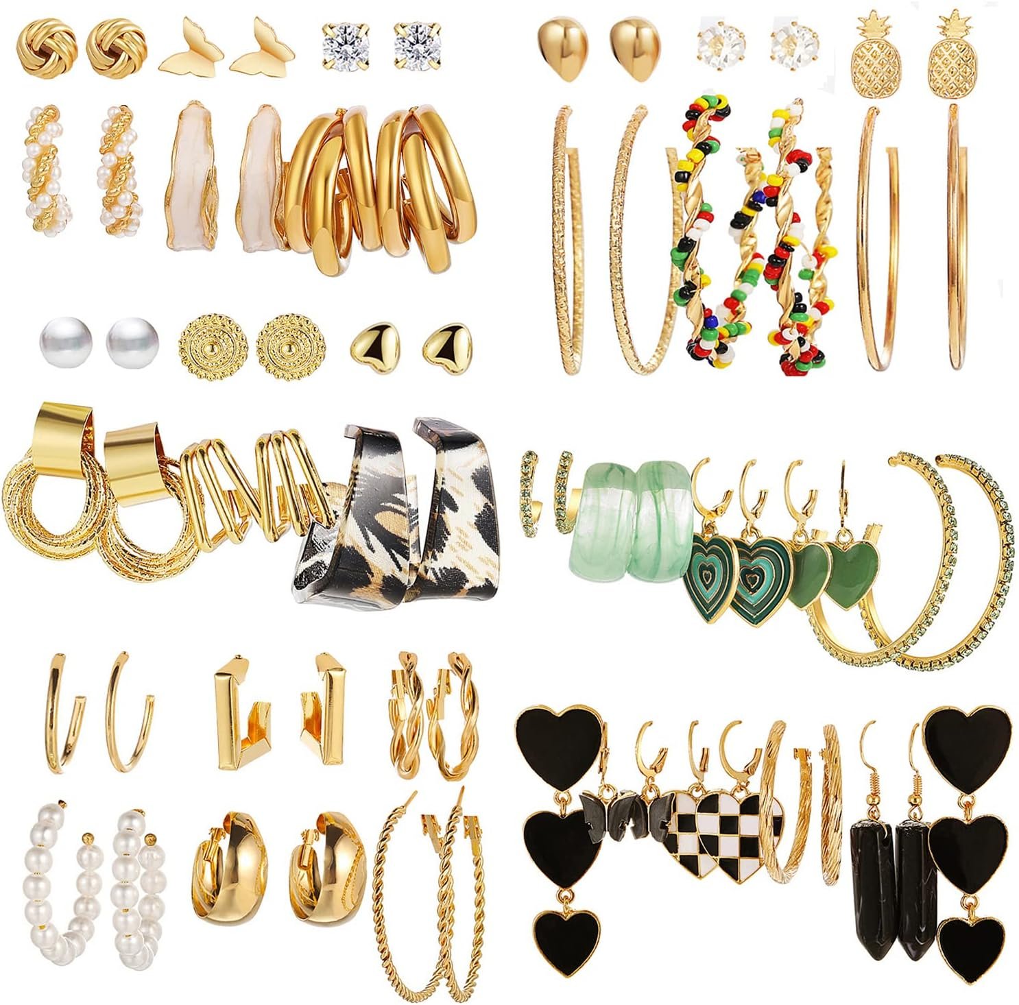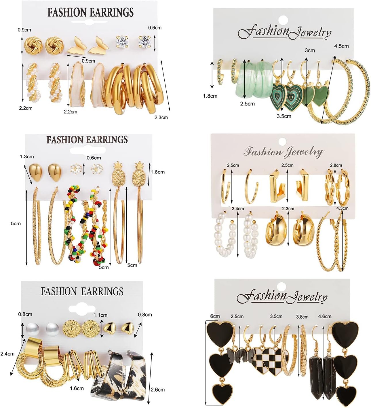 This great value set contains 34 pairs of earrings in different styles and colors, each one is super cute and perfect for everyday wear. Each pair of earrings is handpicked from the client’s favorite earrings, these stylish drop earrings include butterfly, resin, leopard, pearl, pineapple, black hearts, obsidian, colorful large hoop and gold hoop earrings in a variety of styles. Make you more attractive every day.