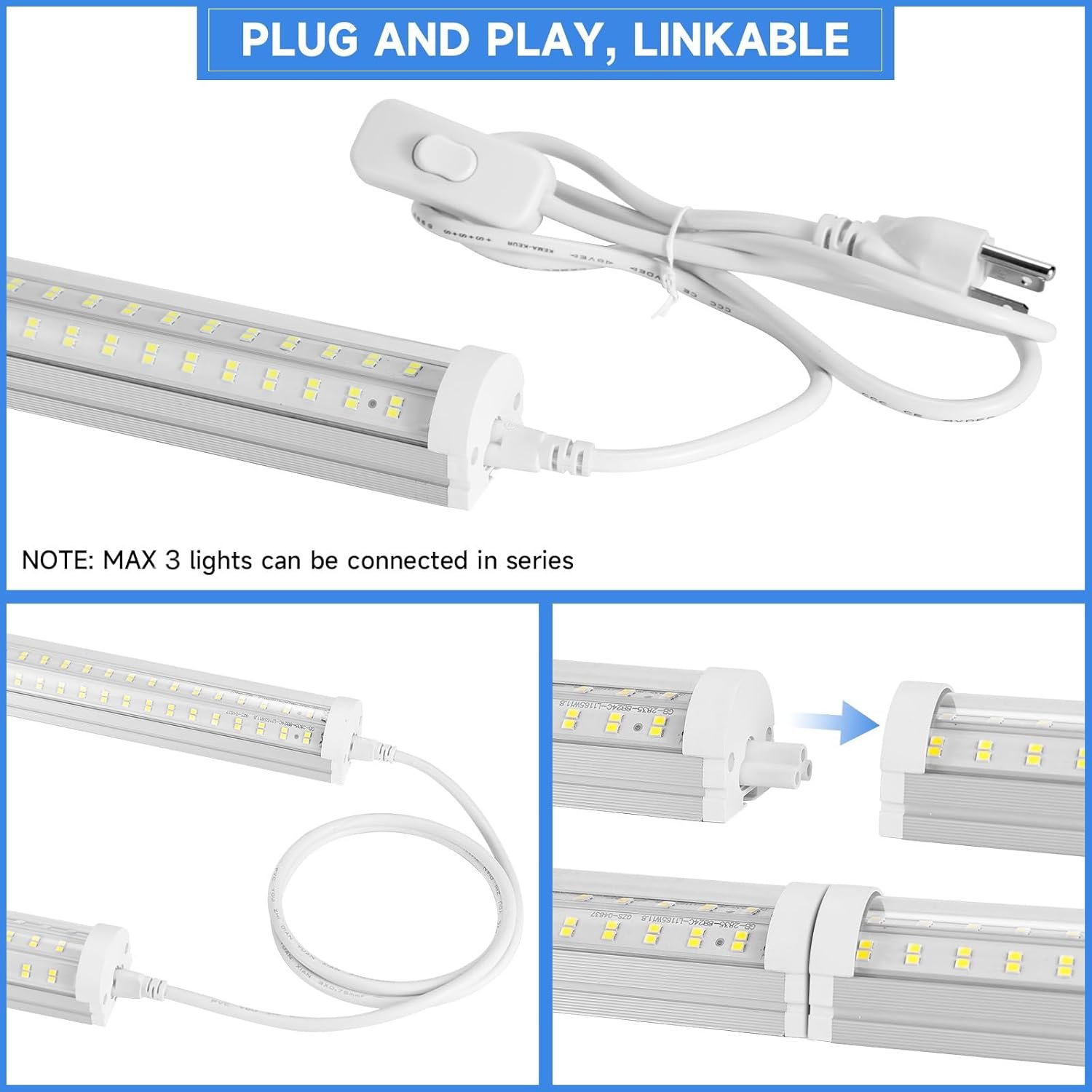 【Linkable & Humanized Design】-Our 8ft led shop lights are linkable and plug & play. You can connect up to 3 light fixtures and avoid the complicated wiring. The prolonged 59-inch power cords with an on/off switch is practical for you to install the light where you want.