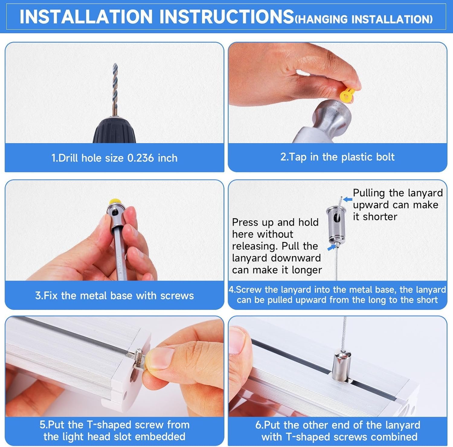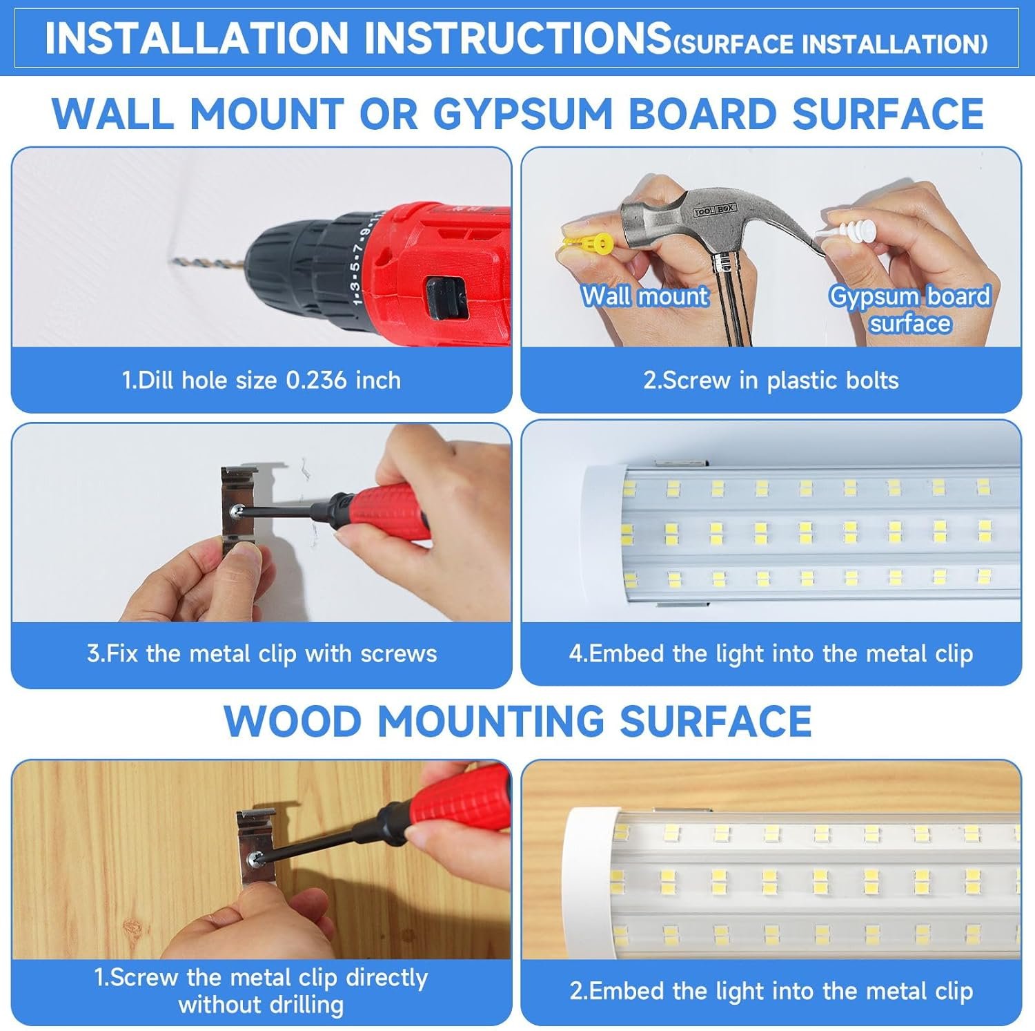 【Hanging or Surface Mount】- With Hanging & Ceiling Clips. You can easily flush mount the 8ft shop light to install it or hang to ceiling. You are free to connect the power by providing a power cord or just hardwiring it. You are also free to connect the lights together by the ends or with the provided 2-end extension cord. The 8FT led light is widely used in garage, workbench, basement, workshop, warehouse, barn, office, library, etc