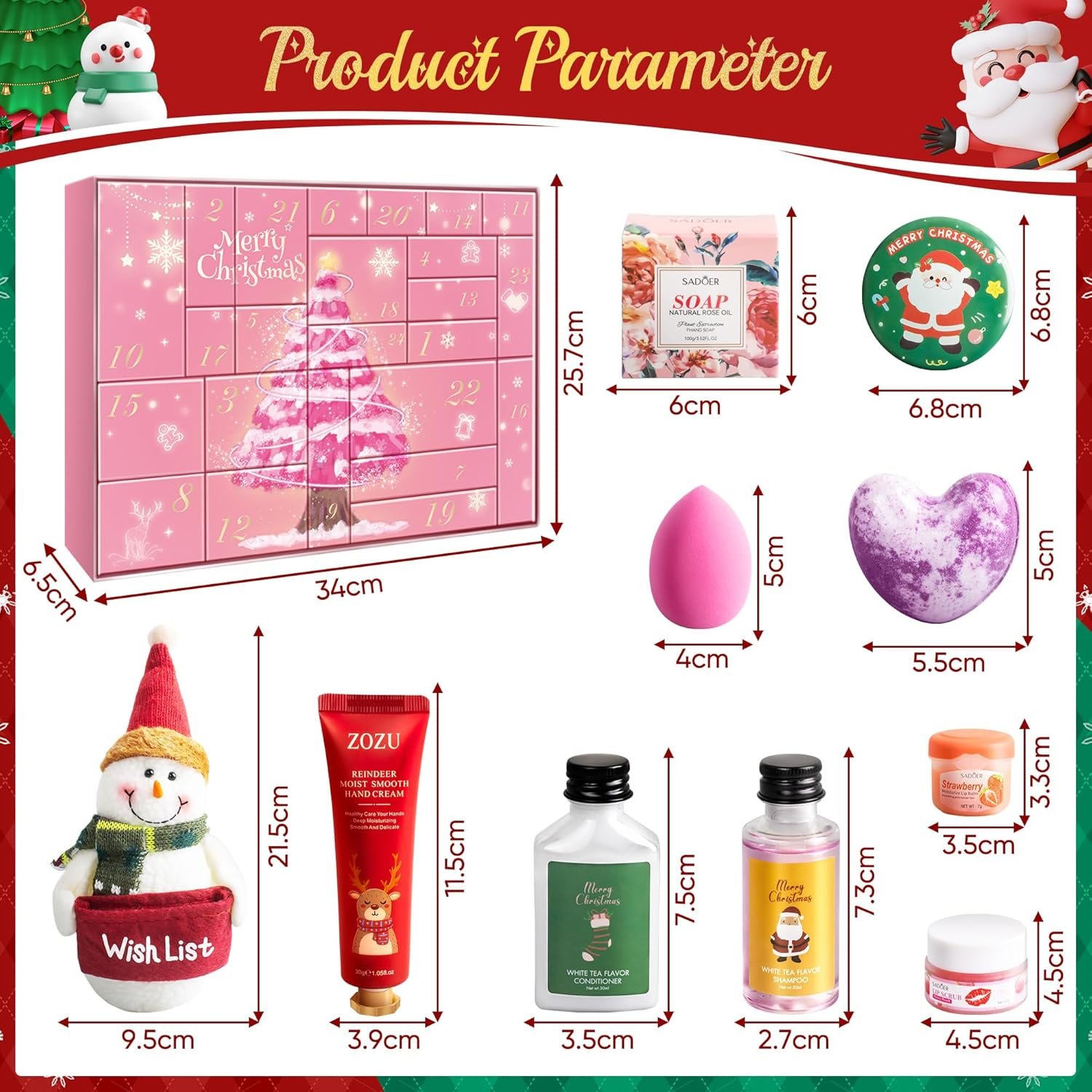 2024 Christmas Gift Set: The skin care advent calendar includes Conditioner, Lip Scrub, Body Wash, Heart Bath Ball, Hair Clip, Mirror, Hand Cream, Christmas Snowman, Christmas Bracelet, Aromatherapy Candle, Christmas Hair Tie, Soap, Beauty Egg, Bell, Lip Balm, Body Lotion, Christmas Hat, Shampoo