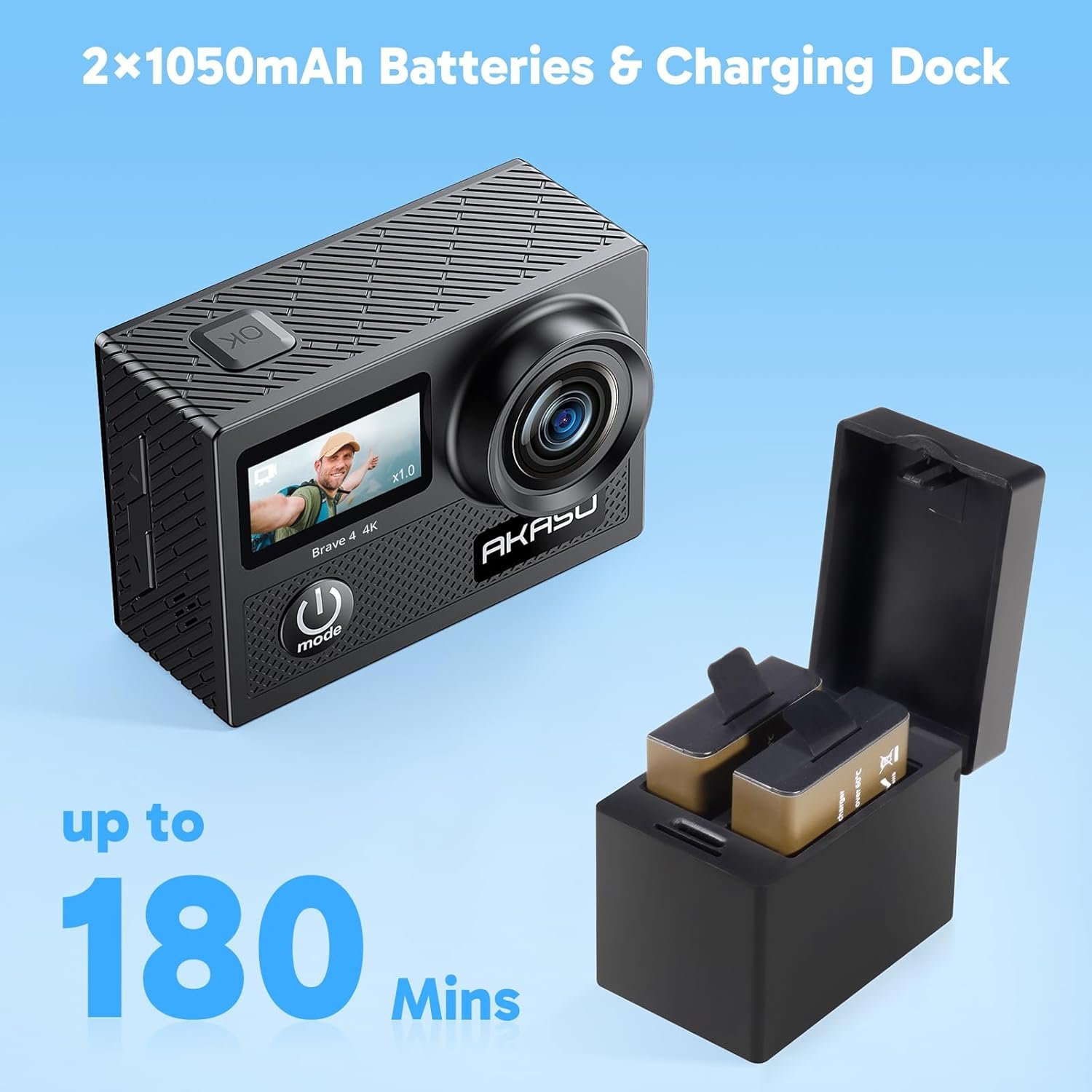 AKASO Brave 4 Action Camera 4K 30fps with 64GB MicroSD U3 Card Bicycle Helmet Accessories Kit Bundle, 20MP Ultra HD 131FT Waterproof Underwater Camera EIS WiFi Remote Control 5X Zoom Sport Cameras