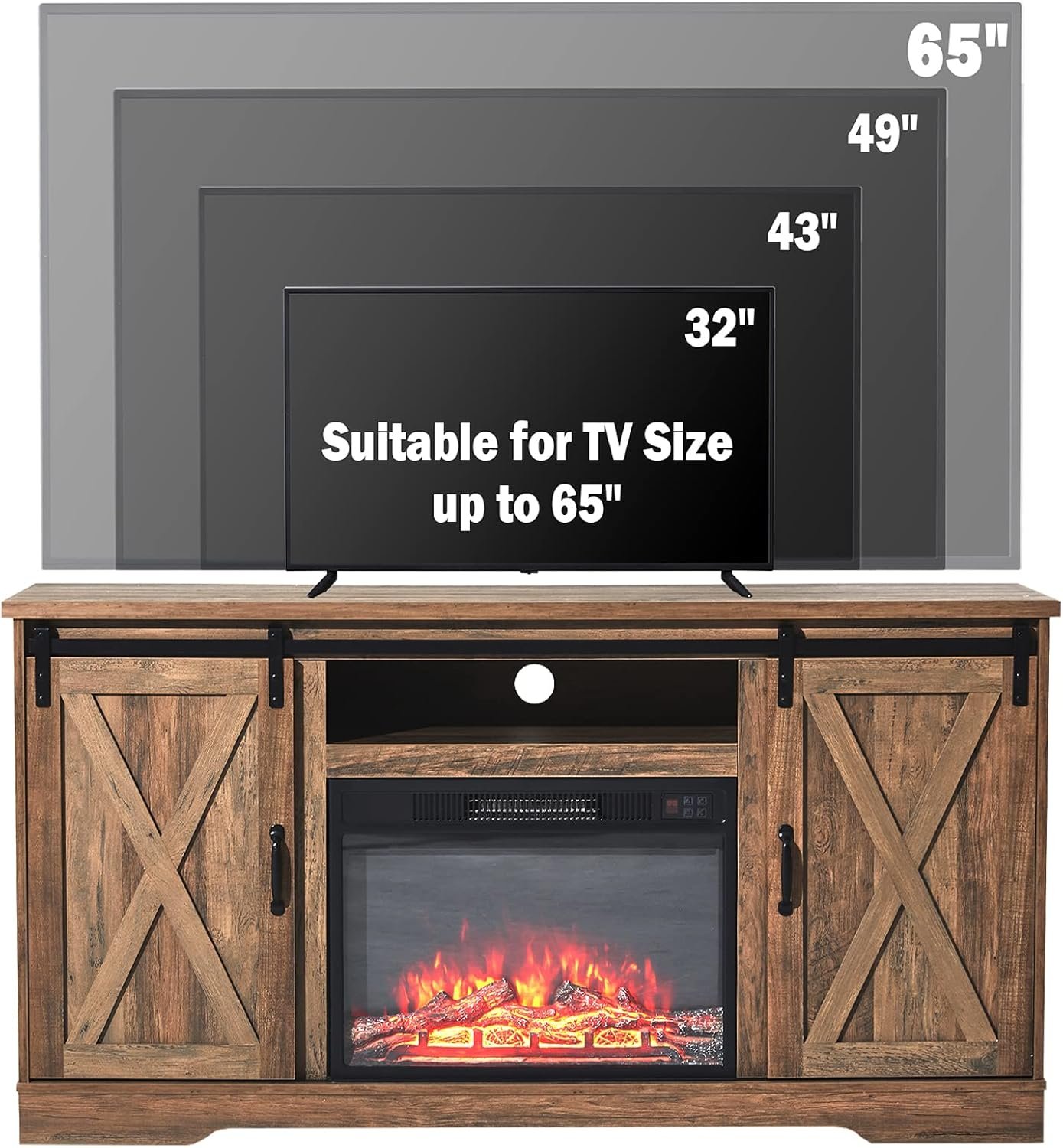 AMERLIFE Fireplace TV Stand with Sliding Barn Door for TVs up to 65″, Farmhouse 59″ Fireplace Entertainment Center with Storage Cabinets/Adjustable Shelves, Barnwood