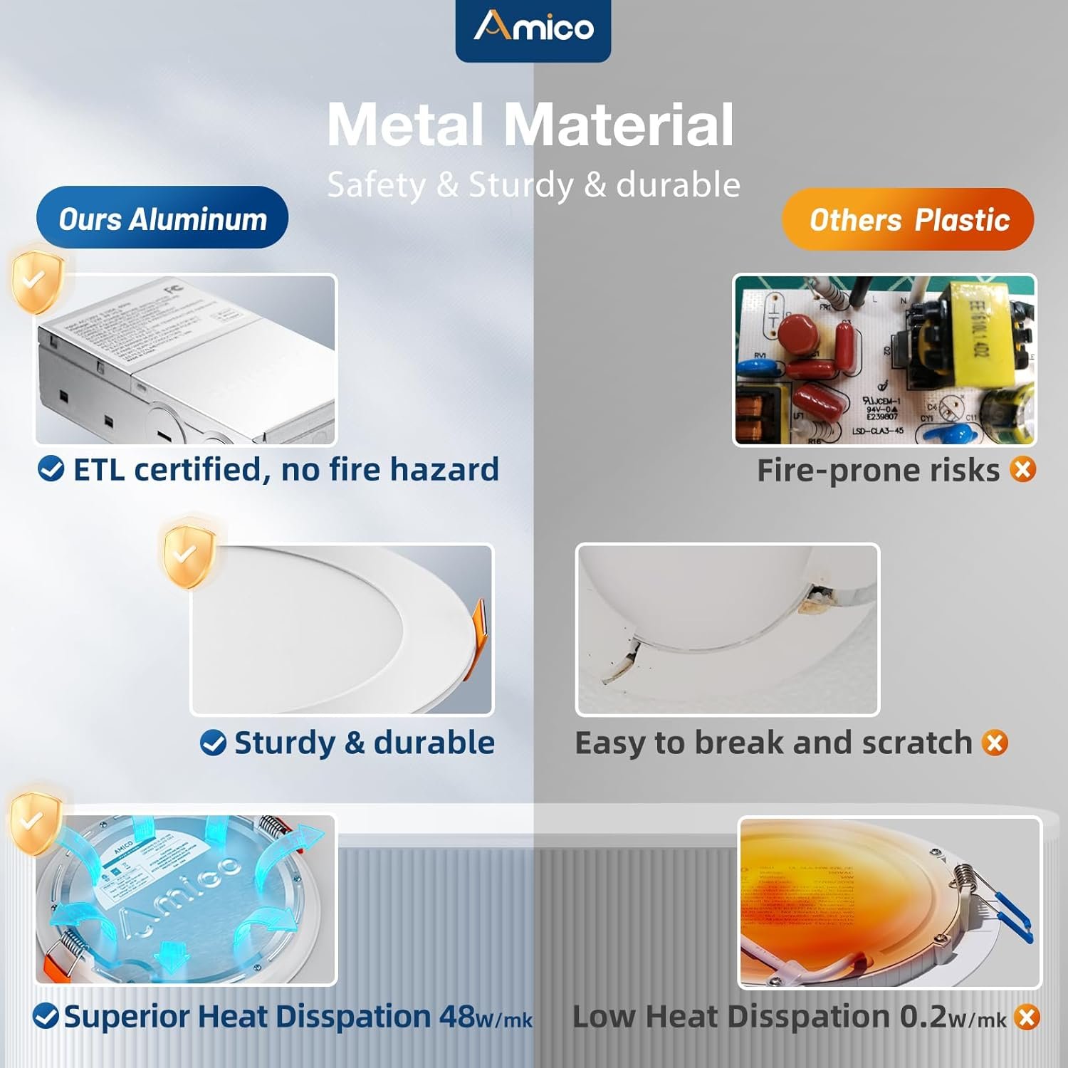 IC Rated: Amico’s canless LED recessed light is IC rated, which is permitted to be in proximity to insulations in ceilings, meaning the junction box is thermally protected. It only requires as small as 2 inches ceiling spaces, fits various ceilings, and joists. It won’t cause a fire in the roof or overhead joist space.