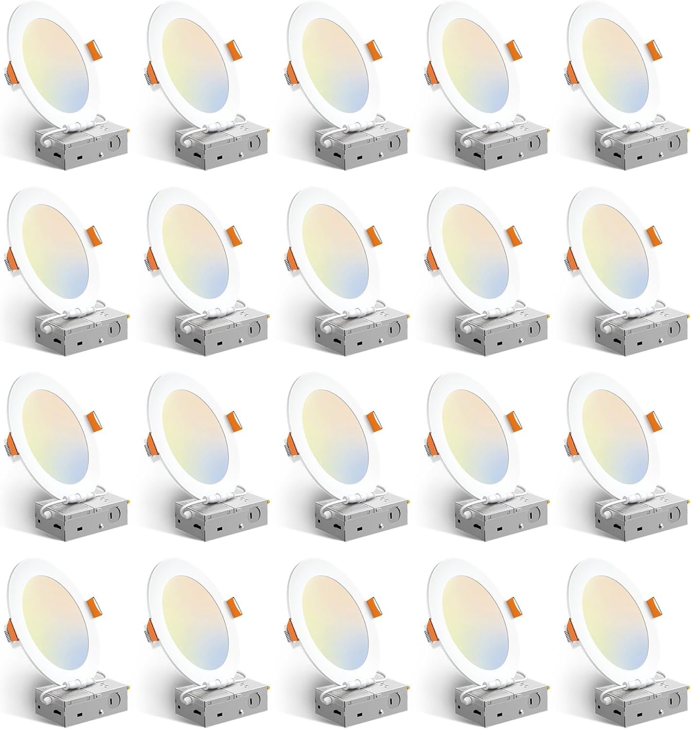 Amico 20 Pack 6 Inch 5CCT Ultra-Thin LED Recessed Ceiling Light with Junction Box, 2700K/3000K/3500K/4000K/5000K Selectable, 12W Eqv 110W, Dimmable Can-Killer Downlight, 1050LM Wafer Lighting – ETL