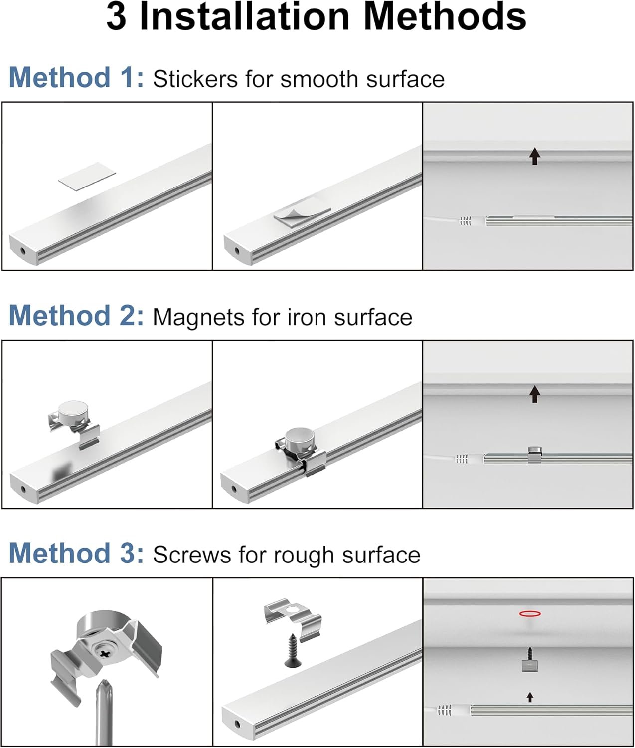 ★【𝐓𝐡𝐫𝐞𝐞 𝐖𝐚𝐲𝐬 𝐭𝐨 𝐈𝐧𝐬𝐭𝐚𝐥𝐥】No need to hire anyone to install the lights, just use the strong Magnetic Clips and 3M Stickers, you can mount the LED counter lights anywhere and remove anytime you need; Or you can install by the Screw, all accessories are included packing.