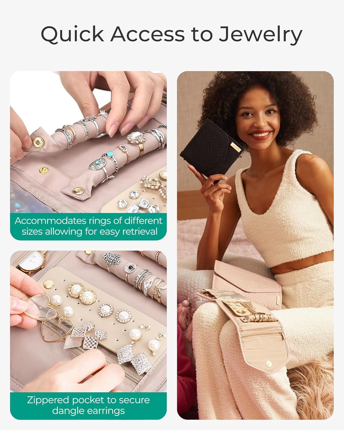 5 Compartments : Buckle band for rings + earrings panel + necklace buckled strap + interlayer visible zip pouch, and long zip pocket