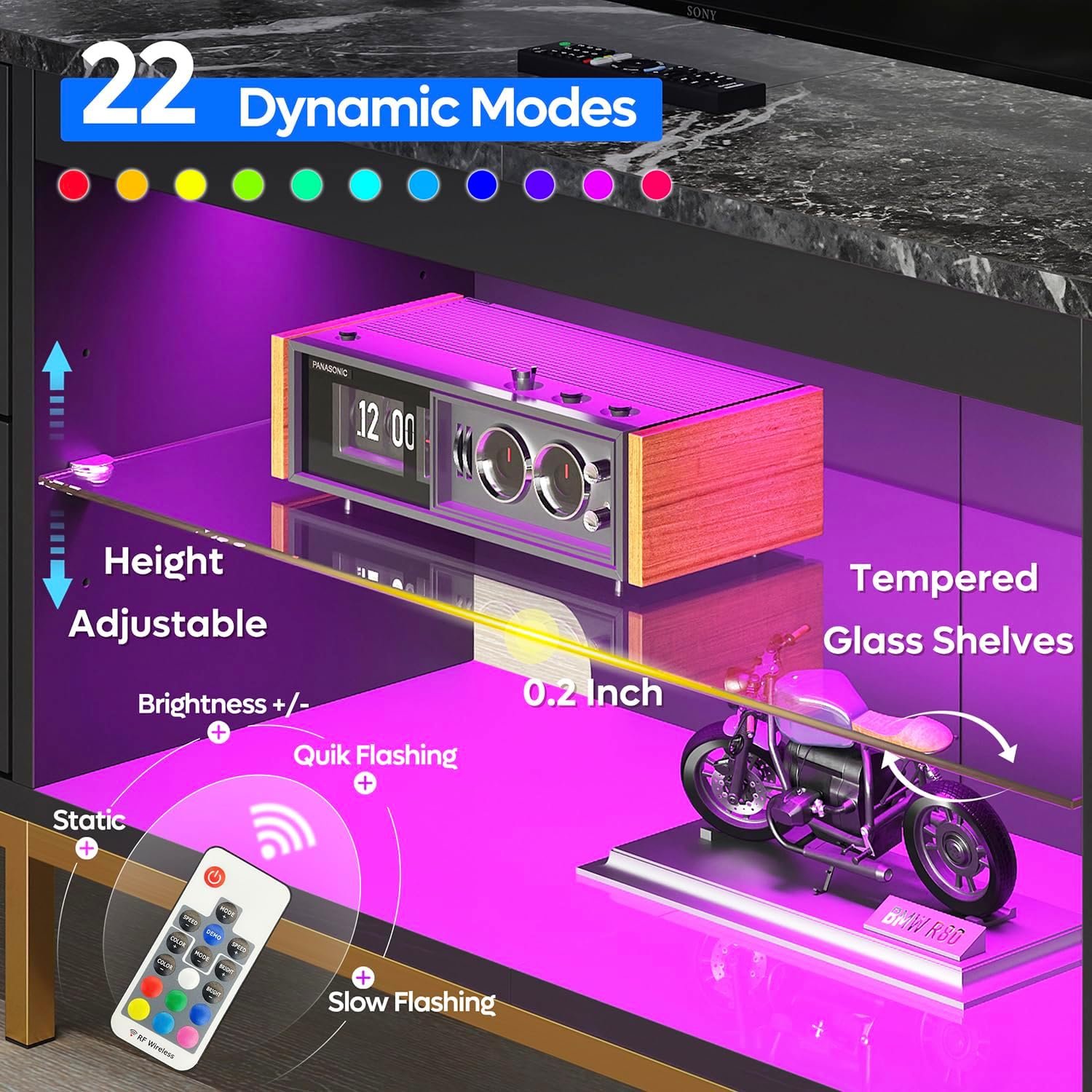 【Sturdy Solid Material】Our TV stand made of high quality carb P2 class particle board and tempered glass, this media console is reinforced with metal on the bottom legs for a stronger overall structural connection, and can hold up to 200 pounds, enough to set down all your daily needs.