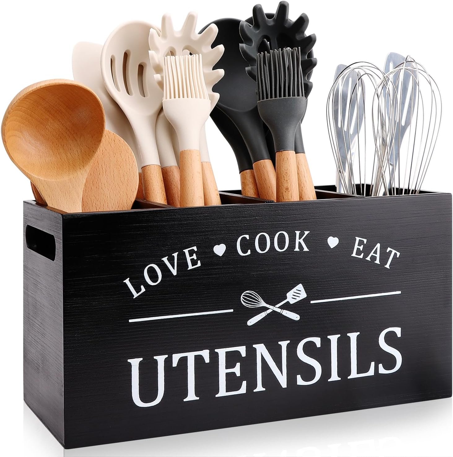 Wooden Utensil Organizer with 4 Compartments: VERY handy! Very well made, very sturdy. Plenty of space to hold all your utensils and keep them organized on your countertop.