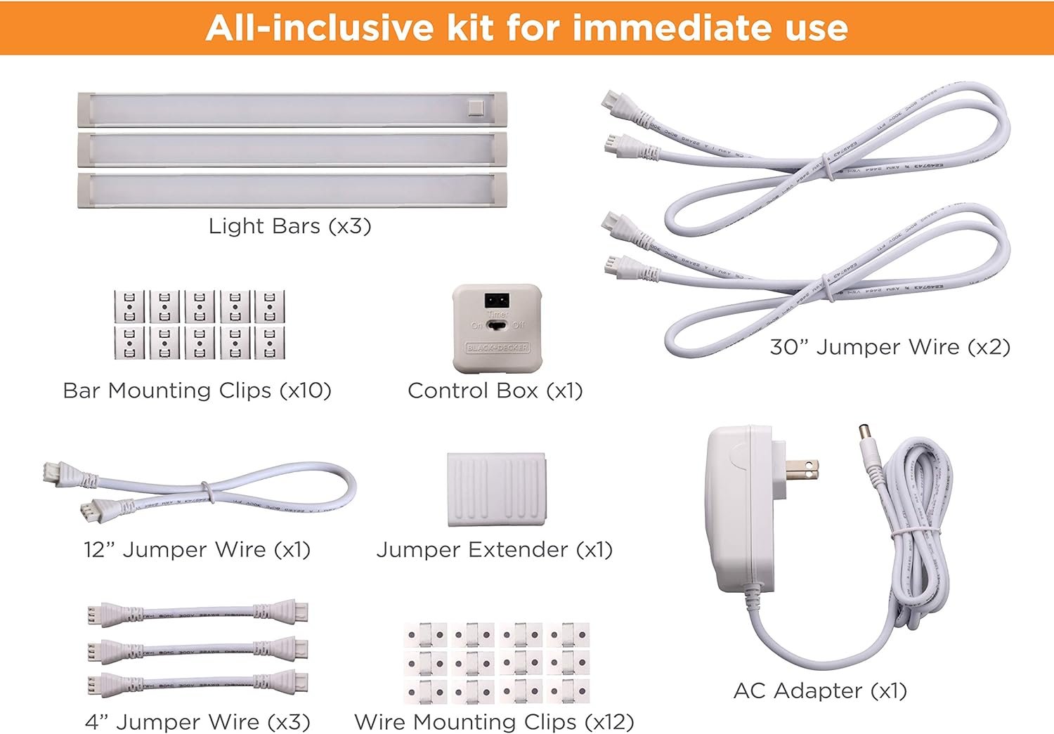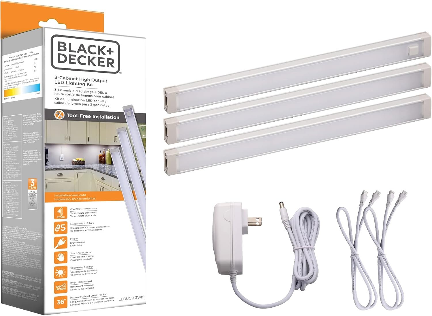 BLACK+DECKER LED Under Cabinet Lighting Kit, 3-Bars, 9 Inches Each, DIY Tool-Free Installation, Warm White, 2700K, 1080 Lumens, 15 Watts, Home Accent (LEDUC9-3WK)