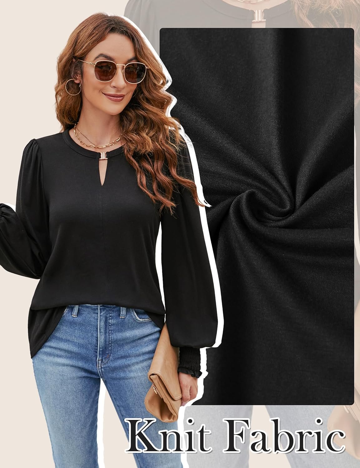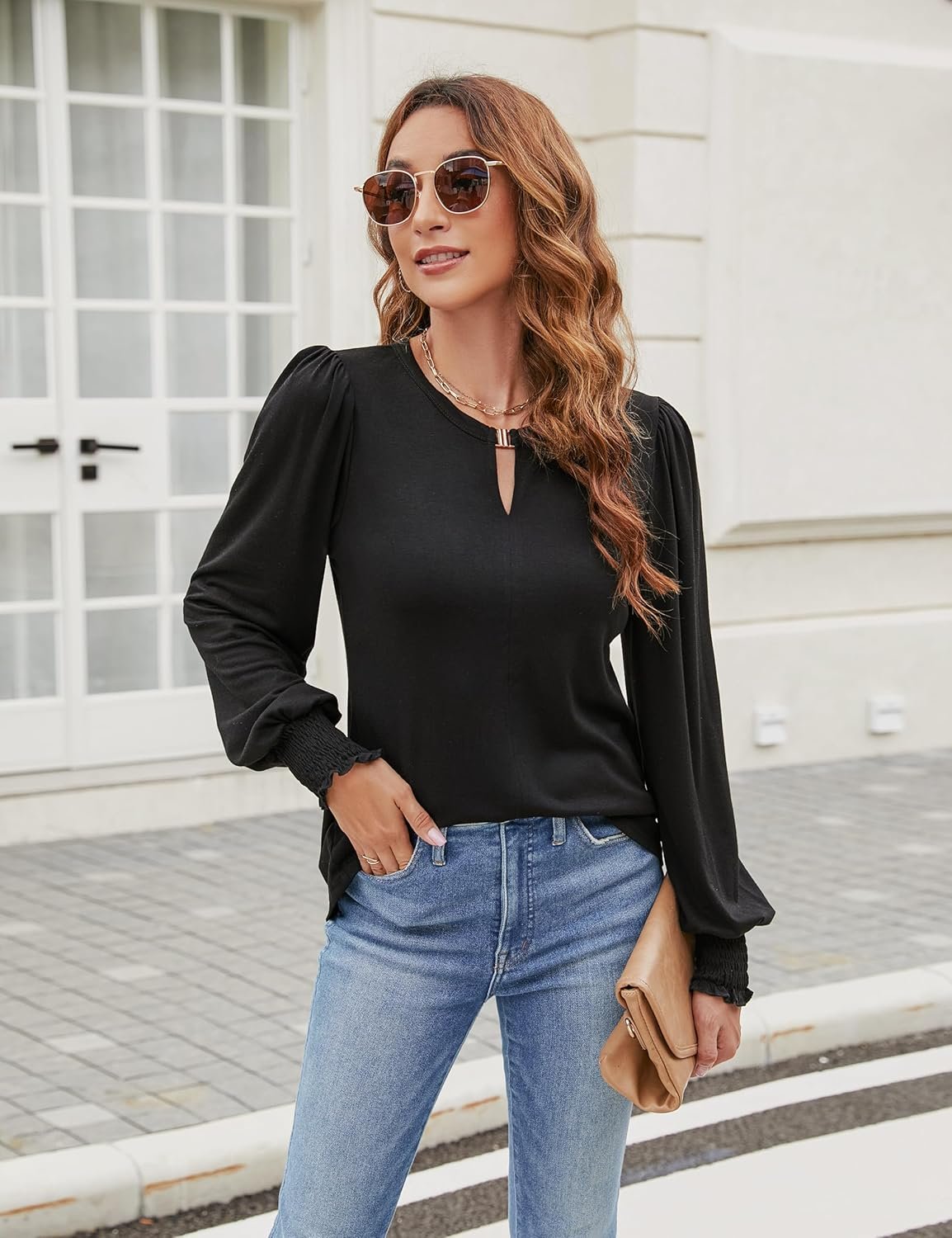 Blooming Jelly Womens Long Sleeve Dressy Casual Top V Neck Puff Sleeve Shirt Keyhole Blouse 2024