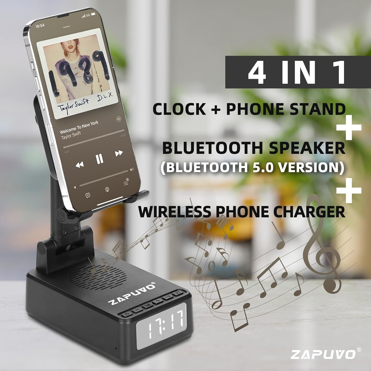 4 in 1 Portable Phone Stand Bluetooth Speaker with Phone Wireless Charging, Alarm Clock: Looking for a powerful Christmas Gifts for dad or Birthday Anniversary Gifts for husband? Look no further than ZAPUVO Portable bluetooth speaker with phone holder & phone wireless charging for desk, making it a great gift choice for any occasion including Fathers Day, Birthday, Anniversary! With clear loud sound, long battery life, portable design, and effortless connectivity, you and your love can enjoy music with you wherever you go