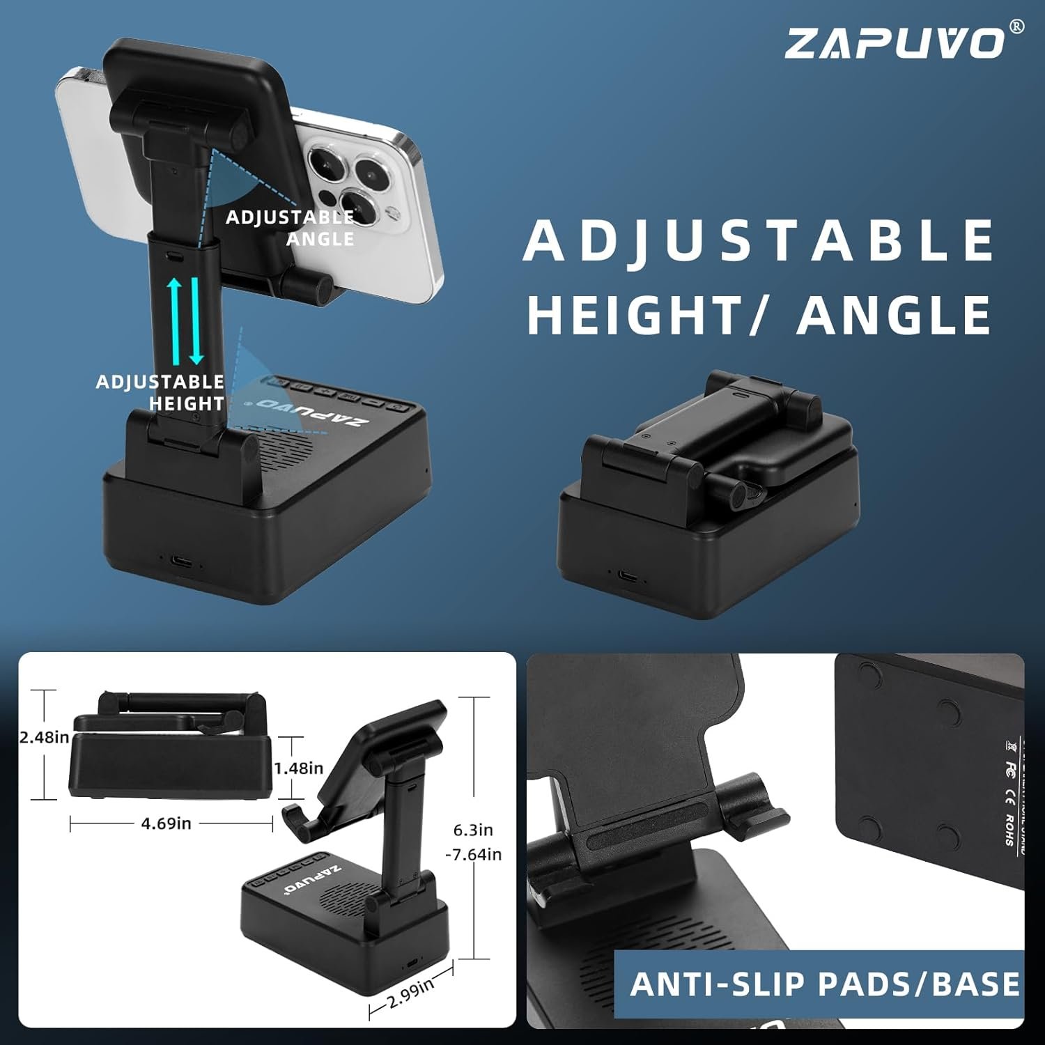 Portable Cellphone Charging Design – Hands- free entertainment: Adjust the distance of the panel to easily charge your phone while watching videos. Whether you want to watch videos or tiktok, you can adjust the holder to meet your viewing needs. Easy to connect via Bluetooth 5.0. The speaker stand pad and the bottom of this phone accessories are covered by anti-skid silicone, which can provide maximum protection for your device from any scratches and slide