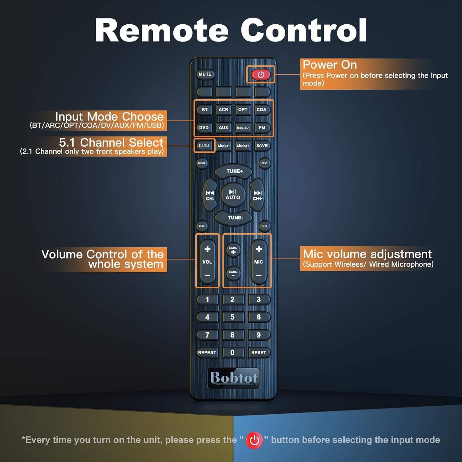 For Home Theater Party – Bobtot surround sound speakers use high-quality MDF wood cabinets with plastic front panels, and digital display functions. It also has a built-In FM Receiver with Amazing Reception. USB/SD input. 2 ¼” MIC Inputs with Echo function for karaoke